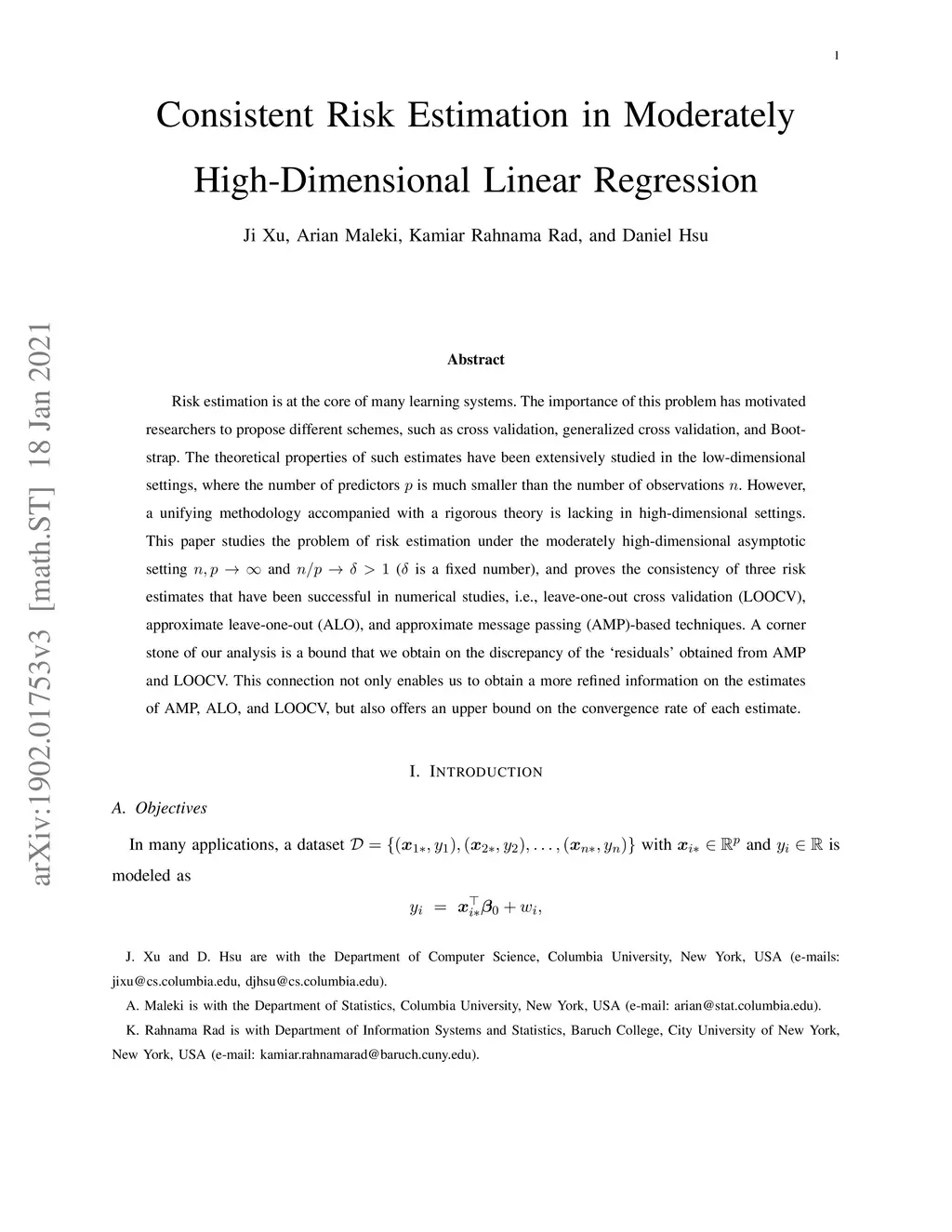 Risk estimation is at the core of many learning systems. The importance of this problem has motivated researchers to propose different schemes, such as cross validation, generalized cross validation, and Bootstrap. The theoretical properties of such estimates have been extensively studied in the low-dimensional settings, where the number of predictors is much smaller than the number of observations . However, a unifying methodology accompanied with a rigorous theory is lacking in high-dimensional settings. This paper studies the problem of risk estimation under the moderately high-dimensional asymptotic setting and ( is a fixed number), and proves the consistency of three risk estimates that have been successful in numerical studies, i.e., leave-one-out cross validation (LOOCV), approximate leave-one-out (ALO), and approximate message passing (AMP)-based techniques. A corner stone of our analysis is a bound that we obtain on the discrepancy of the `residuals' obtained from AMP and LOOCV. This connection not only enables us to obtain a more refined information on the estimates of AMP, ALO, and LOOCV, but also offers an upper bound on the convergence rate of each estimate.