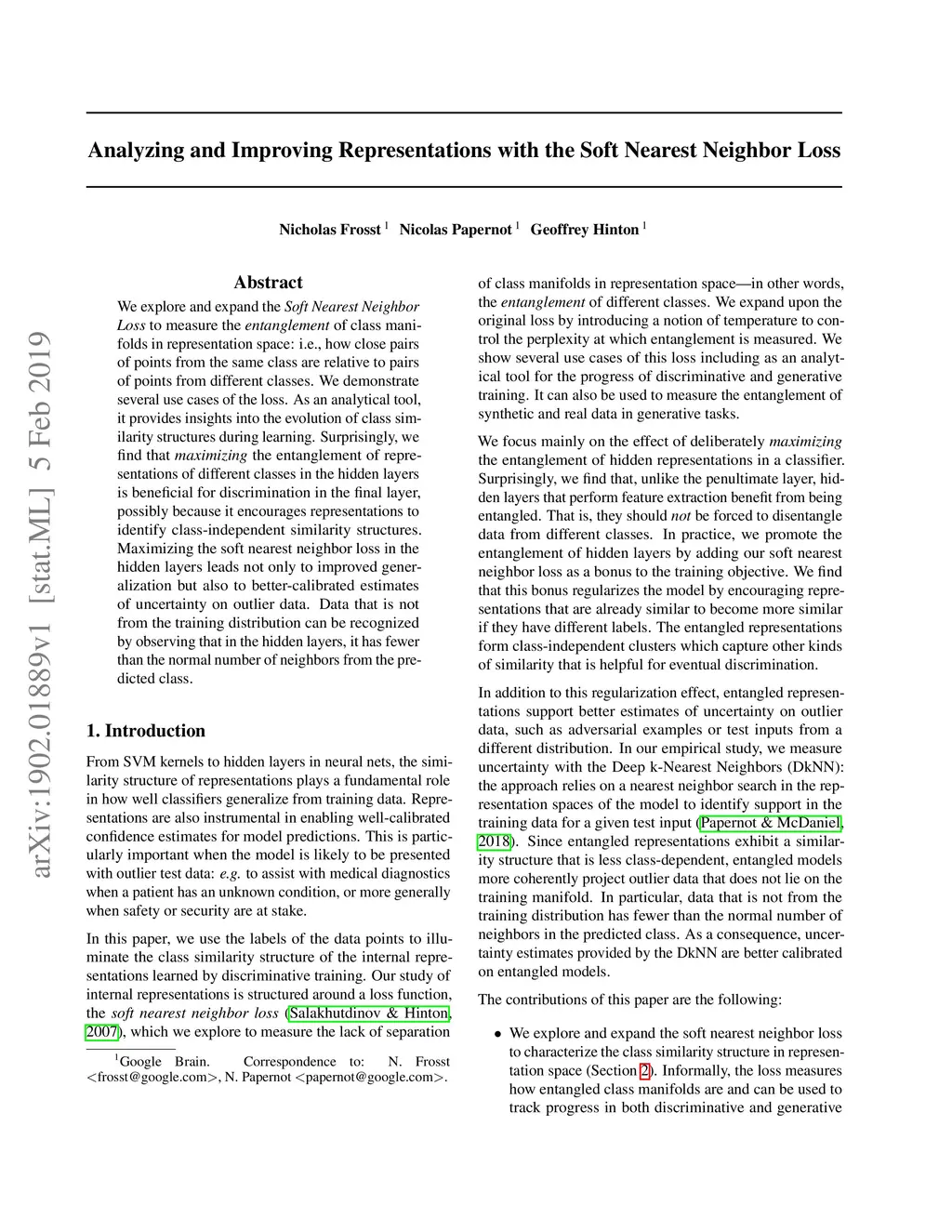 We explore and expand the to measure the of class manifolds in representation space: i.e., how close pairs of points from the same class are relative to pairs of points from different classes. We demonstrate several use cases of the loss. As an analytical tool, it provides insights into the evolution of class similarity structures during learning. Surprisingly, we find that the entanglement of representations of different classes in the hidden layers is beneficial for discrimination in the final layer, possibly because it encourages representations to identify class-independent similarity structures. Maximizing the soft nearest neighbor loss in the hidden layers leads not only to improved generalization but also to better-calibrated estimates of uncertainty on outlier data. Data that is not from the training distribution can be recognized by observing that in the hidden layers, it has fewer than the normal number of neighbors from the predicted class.