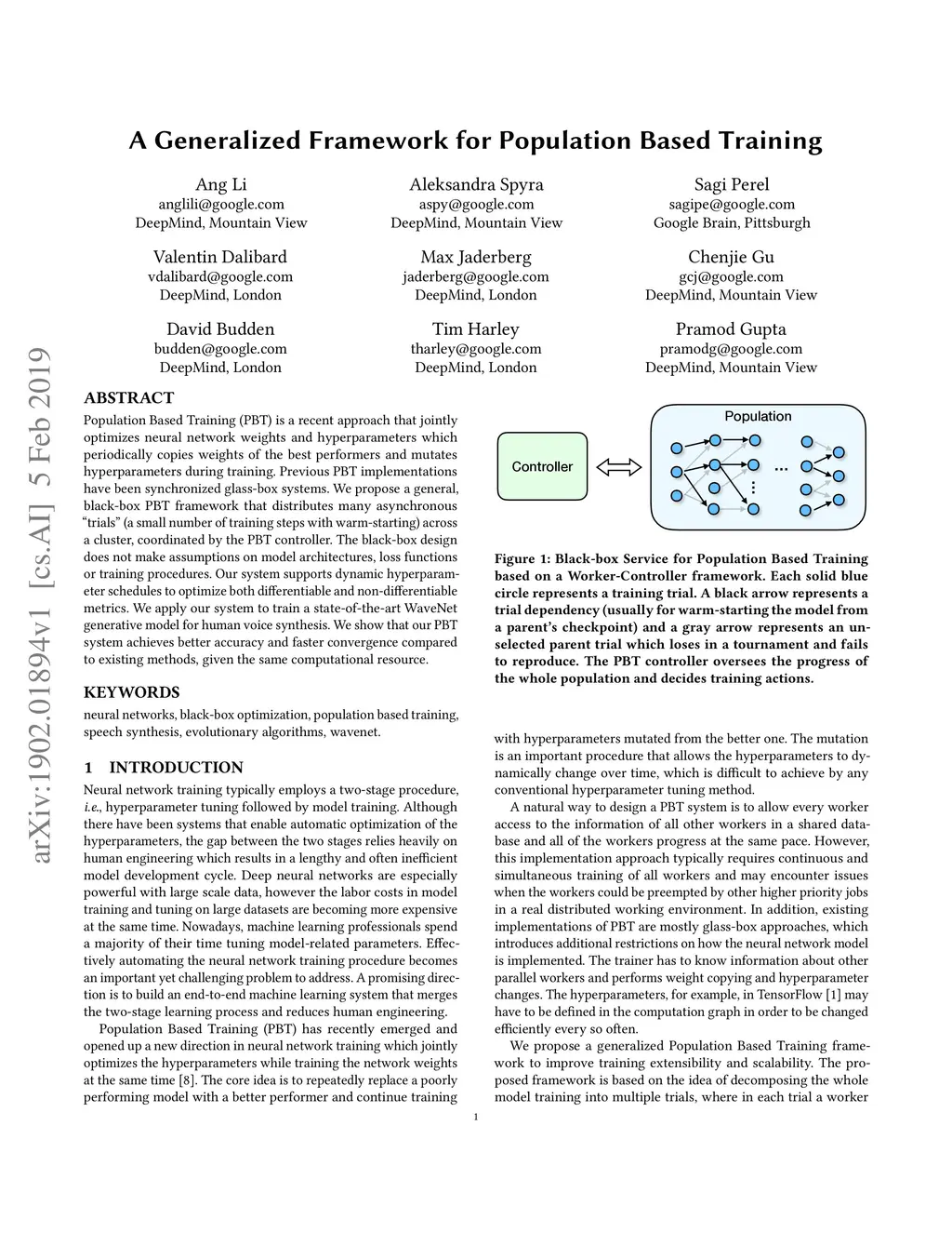 Population Based Training (PBT) is a recent approach that jointly optimizes neural network weights and hyperparameters which periodically copies weights of the best performers and mutates hyperparameters during training. Previous PBT implementations have been synchronized glass-box systems. We propose a general, black-box PBT framework that distributes many asynchronous "trials" (a small number of training steps with warm-starting) across a cluster, coordinated by the PBT controller. The black-box design does not make assumptions on model architectures, loss functions or training procedures. Our system supports dynamic hyperparameter schedules to optimize both differentiable and non-differentiable metrics. We apply our system to train a state-of-the-art WaveNet generative model for human voice synthesis. We show that our PBT system achieves better accuracy, less sensitivity and faster convergence compared to existing methods, given the same computational resource.