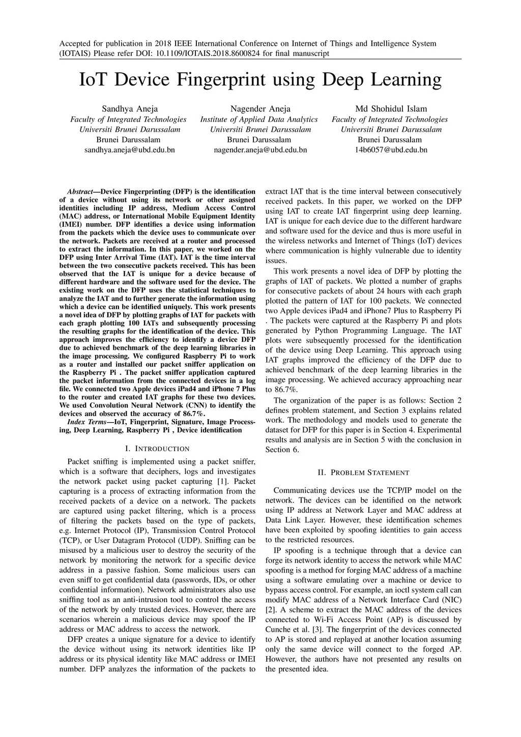 Device Fingerprinting (DFP) is the identification of a device without using its network or other assigned identities including IP address, Medium Access Control (MAC) address, or International Mobile Equipment Identity (IMEI) number. DFP identifies a device using information from the packets which the device uses to communicate over the network. Packets are received at a router and processed to extract the information. In this paper, we worked on the DFP using Inter Arrival Time (IAT). IAT is the time interval between the two consecutive packets received. This has been observed that the IAT is unique for a device because of different hardware and the software used for the device. The existing work on the DFP uses the statistical techniques to analyze the IAT and to further generate the information using which a device can be identified uniquely. This work presents a novel idea of DFP by plotting graphs of IAT for packets with each graph plotting 100 IATs and subsequently processing the resulting graphs for the identification of the device. This approach improves the efficiency to identify a device DFP due to achieved benchmark of the deep learning libraries in the image processing. We configured Raspberry Pi to work as a router and installed our packet sniffer application on the Raspberry Pi . The packet sniffer application captured the packet information from the connected devices in a log file. We connected two Apple devices iPad4 and iPhone 7 Plus to the router and created IAT graphs for these two devices. We used Convolution Neural Network (CNN) to identify the devices and observed the accuracy of 86.7%.