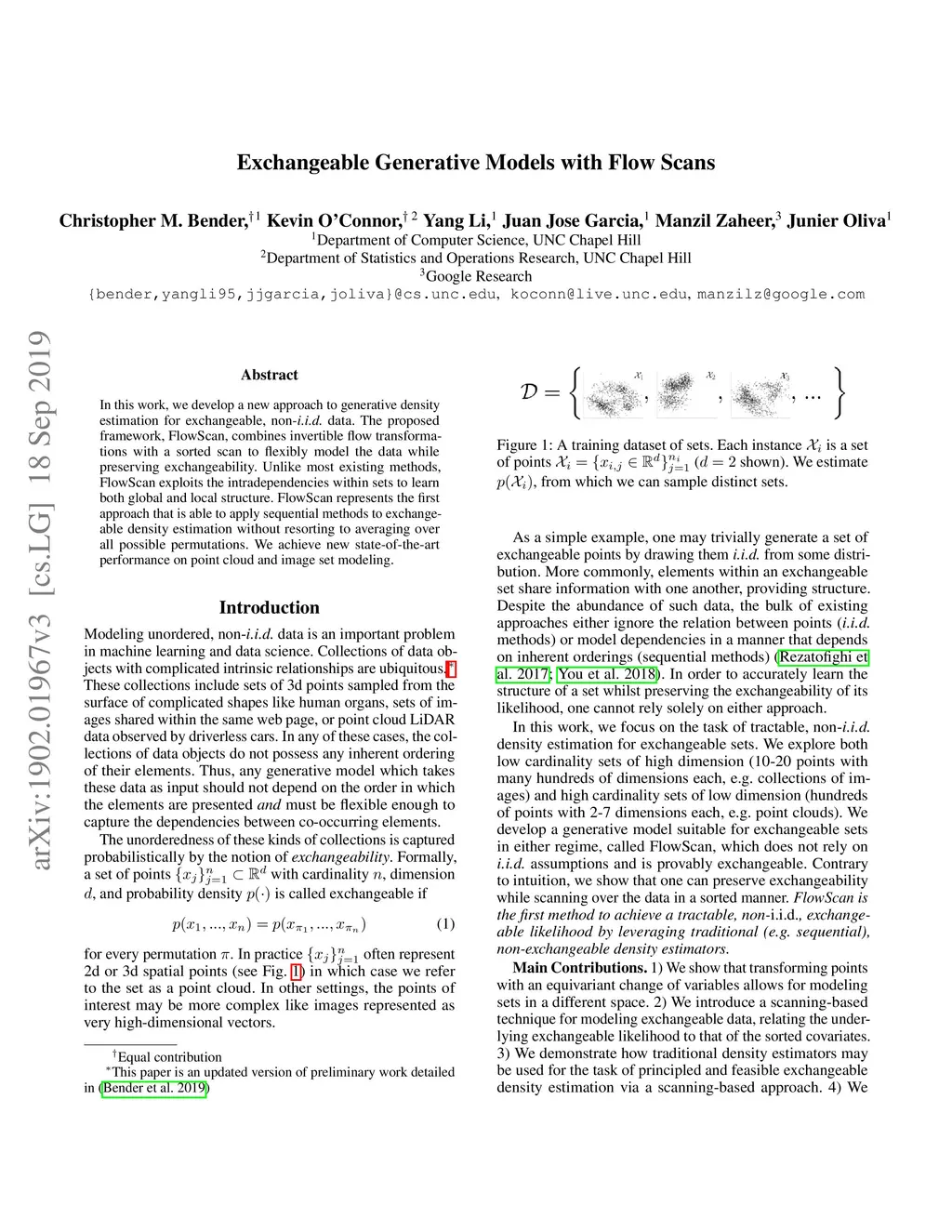 In this work, we develop a new approach to generative density estimation for exchangeable, non-i.i.d. data. The proposed framework, FlowScan, combines invertible flow transformations with a sorted scan to flexibly model the data while preserving exchangeability. Unlike most existing methods, FlowScan exploits the intradependencies within sets to learn both global and local structure. FlowScan represents the first approach that is able to apply sequential methods to exchangeable density estimation without resorting to averaging over all possible permutations. We achieve new state-of-the-art performance on point cloud and image set modeling.