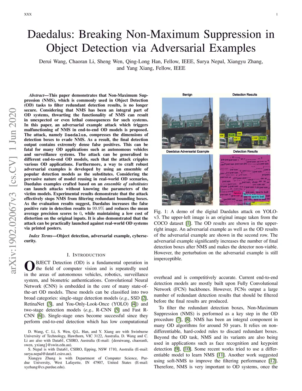 This paper demonstrates that Non-Maximum Suppression (NMS), which is commonly used in Object Detection (OD) tasks to filter redundant detection results, is no longer secure. Considering that NMS has been an integral part of OD systems, thwarting the functionality of NMS can result in unexpected or even lethal consequences for such systems. In this paper, an adversarial example attack which triggers malfunctioning of NMS in end-to-end OD models is proposed. The attack, namely \texttt{Daedalus}, compresses the dimensions of detection boxes to evade NMS. As a result, the final detection output contains extremely dense false positives. This can be fatal for many OD applications such as autonomous vehicles and surveillance systems. The attack can be generalised to different end-to-end OD models, such that the attack cripples various OD applications. Furthermore, a way to craft robust adversarial examples is developed by using an ensemble of popular detection models as the substitutes. Considering the pervasive nature of model reusing in real-world OD scenarios, Daedalus examples crafted based on an \textit{ensemble of substitutes} can launch attacks without knowing the parameters of the victim models. Experimental results demonstrate that the attack effectively stops NMS from filtering redundant bounding boxes. As the evaluation results suggest, Daedalus increases the false positive rate in detection results to and reduces the mean average precision scores to , while maintaining a low cost of distortion on the original inputs. It is also demonstrated that the attack can be practically launched against real-world OD systems via printed posters.
