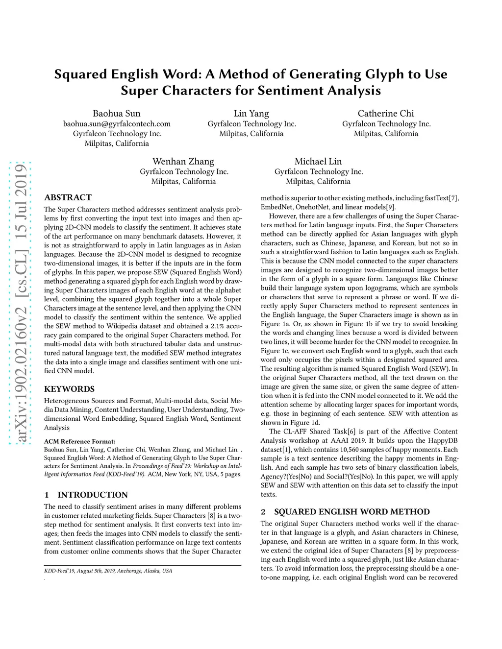 The Super Characters method addresses sentiment analysis problems by first converting the input text into images and then applying 2D-CNN models to classify the sentiment. It achieves state of the art performance on many benchmark datasets. However, it is not as straightforward to apply in Latin languages as in Asian languages. Because the 2D-CNN model is designed to recognize two-dimensional images, it is better if the inputs are in the form of glyphs. In this paper, we propose SEW (Squared English Word) method generating a squared glyph for each English word by drawing Super Characters images of each English word at the alphabet level, combining the squared glyph together into a whole Super Characters image at the sentence level, and then applying the CNN model to classify the sentiment within the sentence. We applied the SEW method to Wikipedia dataset and obtained a 2.1% accuracy gain compared to the original Super Characters method. For multi-modal data with both structured tabular data and unstructured natural language text, the modified SEW method integrates the data into a single image and classifies sentiment with one unified CNN model.