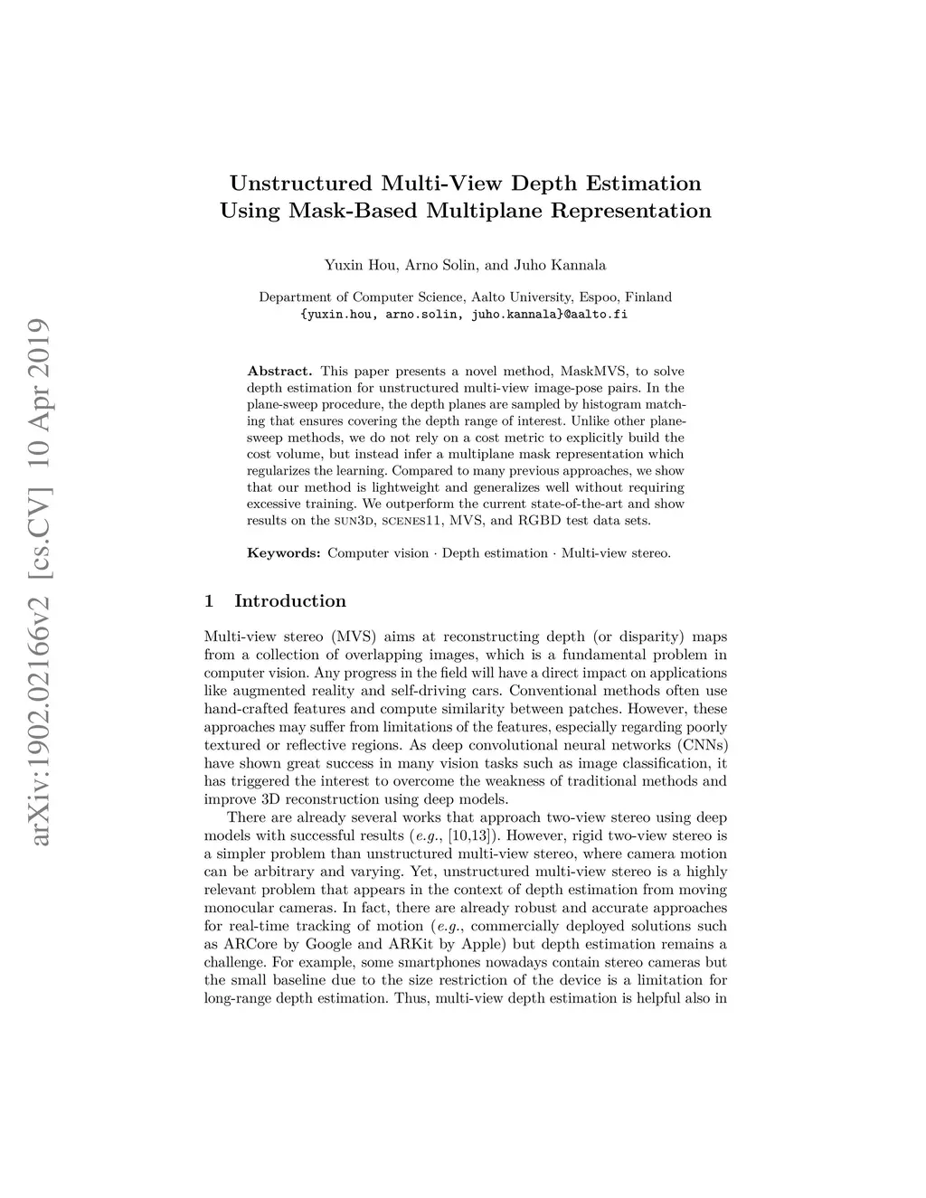 Unstructured Multi-View Depth Estimation Using Mask-Based Multiplane