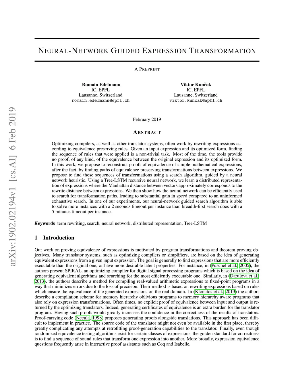 Optimizing compilers, as well as other translator systems, often work by rewriting expressions according to equivalence preserving rules. Given an input expression and its optimized form, finding the sequence of rules that were applied is a non-trivial task. Most of the time, the tools provide no proof, of any kind, of the equivalence between the original expression and its optimized form. In this work, we propose to reconstruct proofs of equivalence of simple mathematical expressions, after the fact, by finding paths of equivalence preserving transformations between expressions. We propose to find those sequences of transformations using a search algorithm, guided by a neural network heuristic. Using a Tree-LSTM recursive neural network, we learn a distributed representation of expressions where the Manhattan distance between vectors approximately corresponds to the rewrite distance between expressions. We then show how the neural network can be efficiently used to search for transformation paths, leading to substantial gain in speed compared to an uninformed exhaustive search. In one of our experiments, our neural-network guided search algorithm is able to solve more instances with a 2 seconds timeout per instance than breadth-first search does with a 5 minutes timeout per instance.