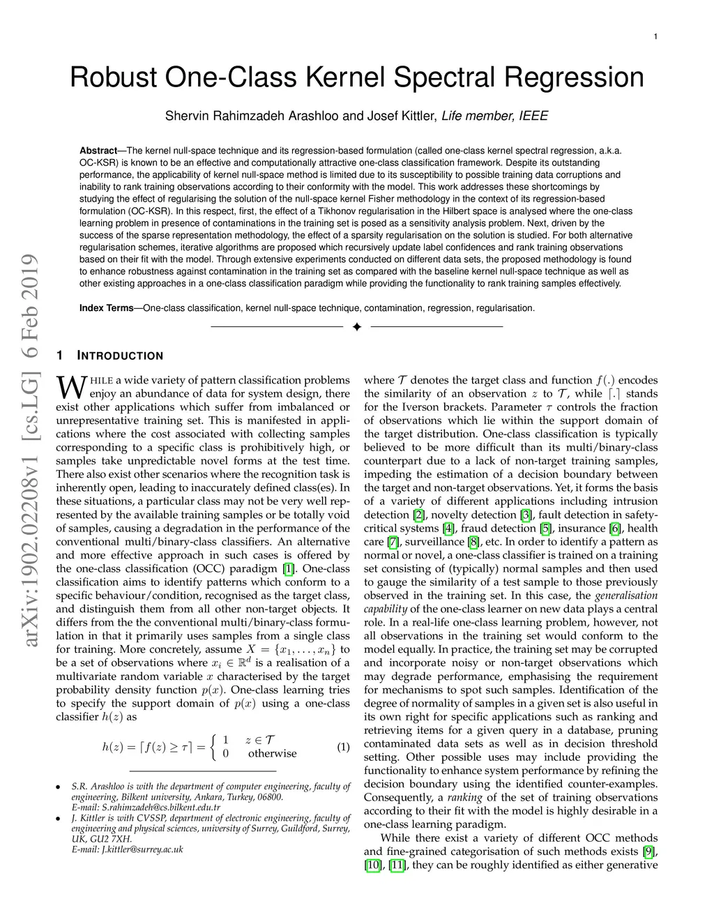 The kernel null-space technique and its regression-based formulation (called one-class kernel spectral regression, a.k.a. OC-KSR) is known to be an effective and computationally attractive one-class classification framework. Despite its outstanding performance, the applicability of kernel null-space method is limited due to its susceptibility to possible training data corruptions and inability to rank training observations according to their conformity with the model. This work addresses these shortcomings by studying the effect of regularising the solution of the null-space kernel Fisher methodology in the context of its regression-based formulation (OC-KSR). In this respect, first, the effect of a Tikhonov regularisation in the Hilbert space is analysed where the one-class learning problem in presence of contaminations in the training set is posed as a sensitivity analysis problem. Next, driven by the success of the sparse representation methodology, the effect of a sparsity regularisation on the solution is studied. For both alternative regularisation schemes, iterative algorithms are proposed which recursively update label confidences and rank training observations based on their fit with the model. Through extensive experiments conducted on different data sets, the proposed methodology is found to enhance robustness against contamination in the training set as compared with the baseline kernel null-space technique as well as other existing approaches in a one-class classification paradigm while providing the functionality to rank training samples effectively.