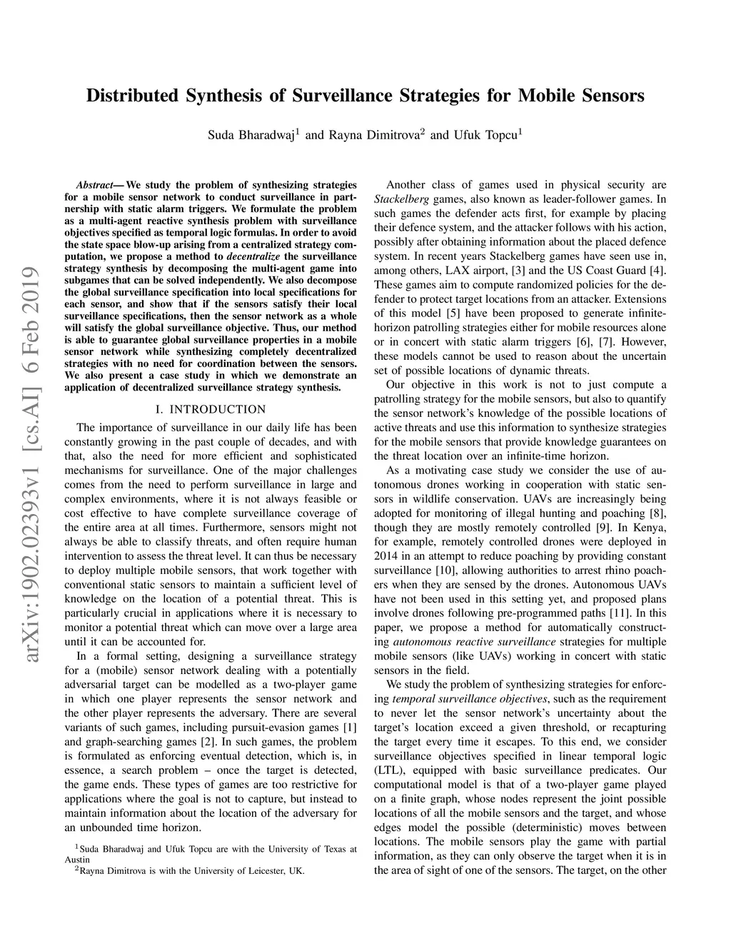 Distributed Synthesis of Surveillance Strategies for Mobile Sensors
