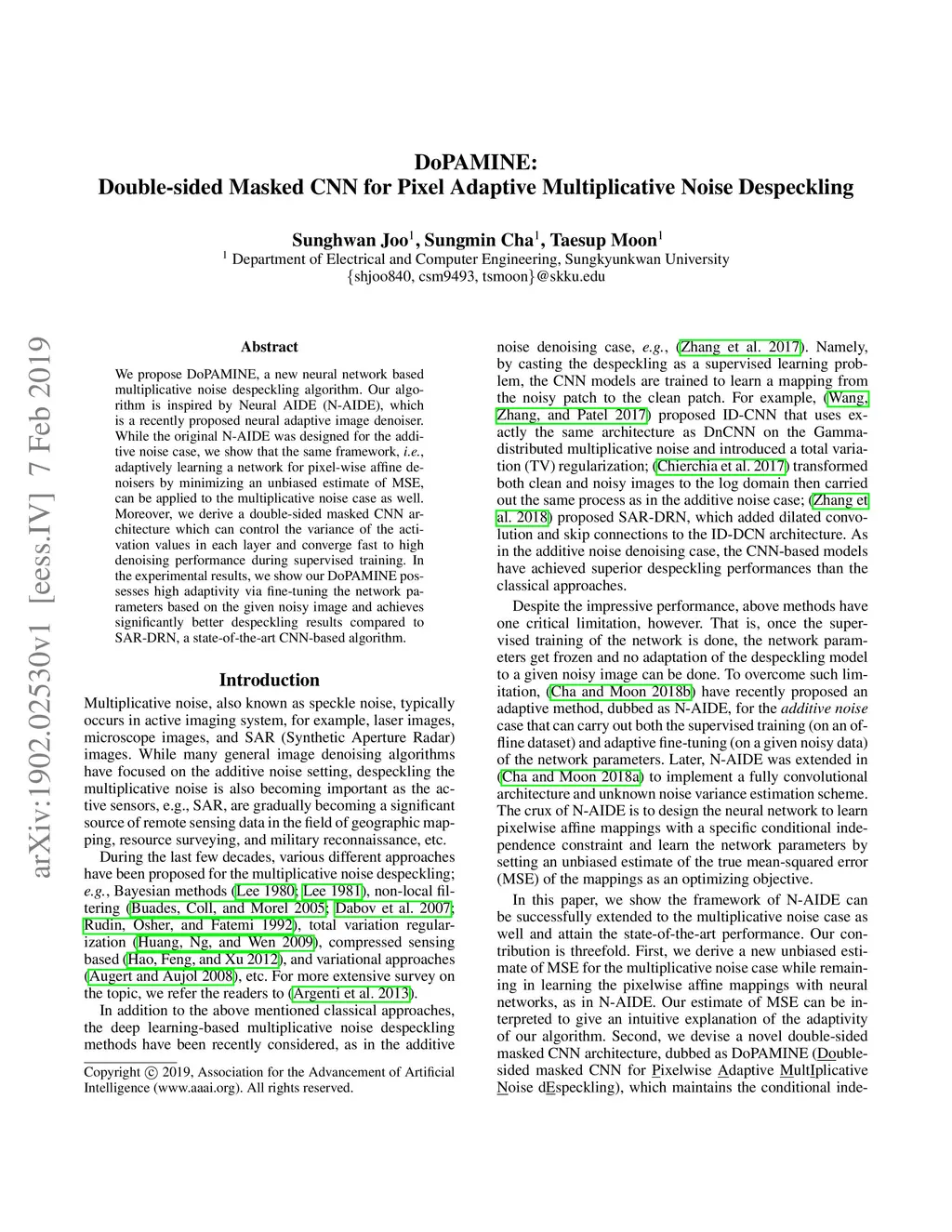We propose DoPAMINE, a new neural network based multiplicative noise despeckling algorithm. Our algorithm is inspired by Neural AIDE (N-AIDE), which is a recently proposed neural adaptive image denoiser. While the original N-AIDE was designed for the additive noise case, we show that the same framework, i.e., adaptively learning a network for pixel-wise affine denoisers by minimizing an unbiased estimate of MSE, can be applied to the multiplicative noise case as well. Moreover, we derive a double-sided masked CNN architecture which can control the variance of the activation values in each layer and converge fast to high denoising performance during supervised training. In the experimental results, we show our DoPAMINE possesses high adaptivity via fine-tuning the network parameters based on the given noisy image and achieves significantly better despeckling results compared to SAR-DRN, a state-of-the-art CNN-based algorithm.