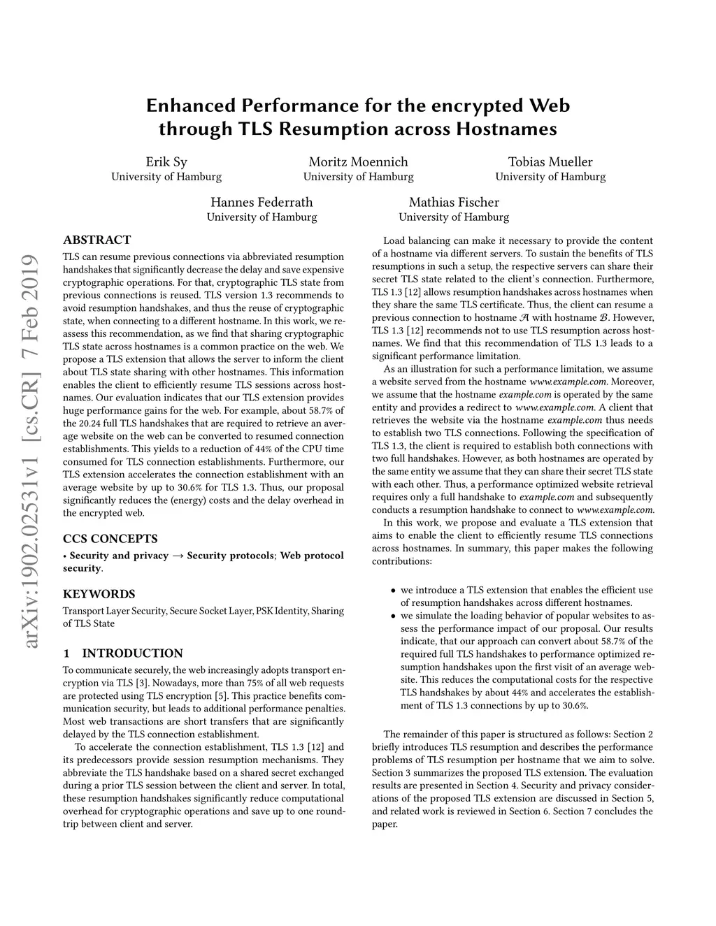 TLS can resume previous connections via abbreviated resumption handshakes that significantly decrease the delay and save expensive cryptographic operations. For that, cryptographic TLS state from previous connections is reused. TLS version 1.3 recommends to avoid resumption handshakes, and thus the reuse of cryptographic state, when connecting to a different hostname. In this work, we reassess this recommendation, as we find that sharing cryptographic TLS state across hostnames is a common practice on the web. We propose a TLS extension that allows the server to inform the client about TLS state sharing with other hostnames. This information enables the client to efficiently resume TLS sessions across hostnames. Our evaluation indicates that our TLS extension provides huge performance gains for the web. For example, about 58.7% of the 20.24 full TLS handshakes that are required to retrieve an average website on the web can be converted to resumed connection establishments. This yields to a reduction of 44% of the CPU time consumed for TLS connection establishments. Furthermore, our TLS extension accelerates the connection establishment with an average website by up to 30.6% for TLS 1.3. Thus, our proposal significantly reduces the (energy) costs and the delay overhead in the encrypted web.