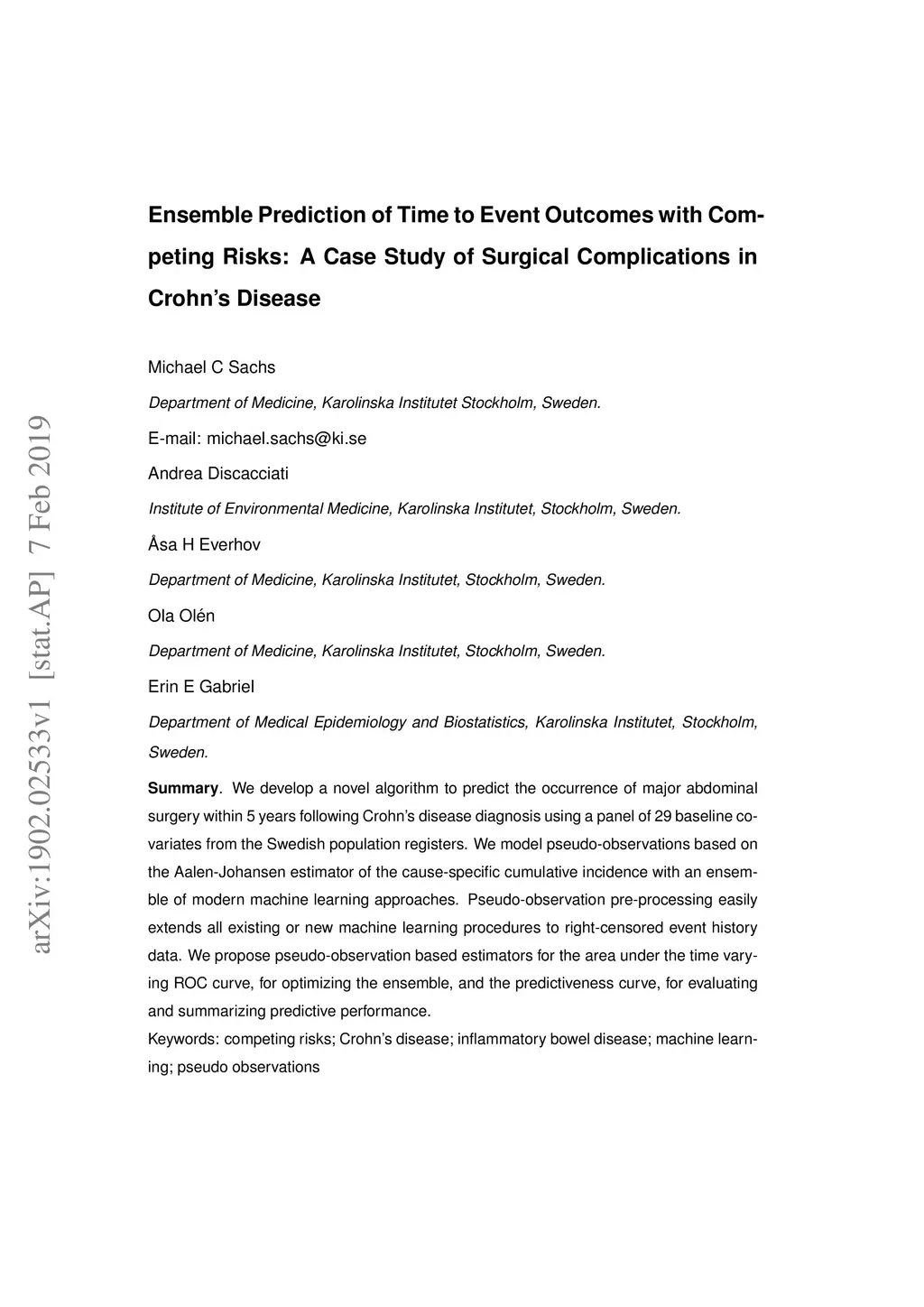 We develop a novel algorithm to predict the occurrence of major abdominal surgery within 5 years following Crohn's disease diagnosis using a panel of 29 baseline covariates from the Swedish population registers. We model pseudo-observations based on the Aalen-Johansen estimator of the cause-specific cumulative incidence with an ensemble of modern machine learning approaches. Pseudo-observation pre-processing easily extends all existing or new machine learning procedures to right-censored event history data. We propose pseudo-observation based estimators for the area under the time varying ROC curve, for optimizing the ensemble, and the predictiveness curve, for evaluating and summarizing predictive performance.