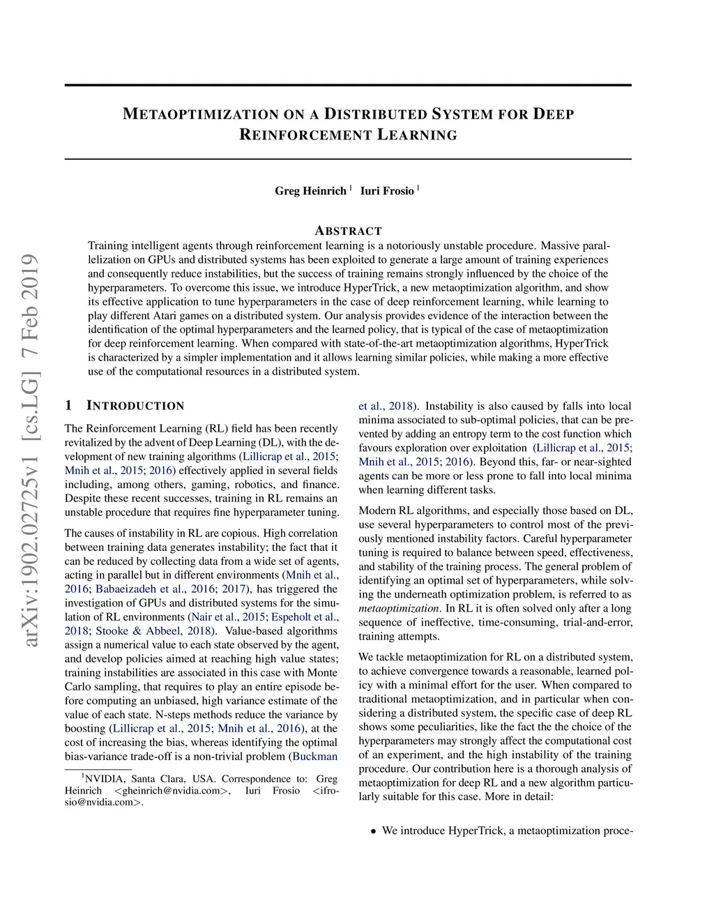 Training intelligent agents through reinforcement learning is a notoriously unstable procedure. Massive parallelization on GPUs and distributed systems has been exploited to generate a large amount of training experiences and consequently reduce instabilities, but the success of training remains strongly influenced by the choice of the hyperparameters. To overcome this issue, we introduce HyperTrick, a new metaoptimization algorithm, and show its effective application to tune hyperparameters in the case of deep reinforcement learning, while learning to play different Atari games on a distributed system. Our analysis provides evidence of the interaction between the identification of the optimal hyperparameters and the learned policy, that is typical of the case of metaoptimization for deep reinforcement learning. When compared with state-of-the-art metaoptimization algorithms, HyperTrick is characterized by a simpler implementation and it allows learning similar policies, while making a more effective use of the computational resources in a distributed system.