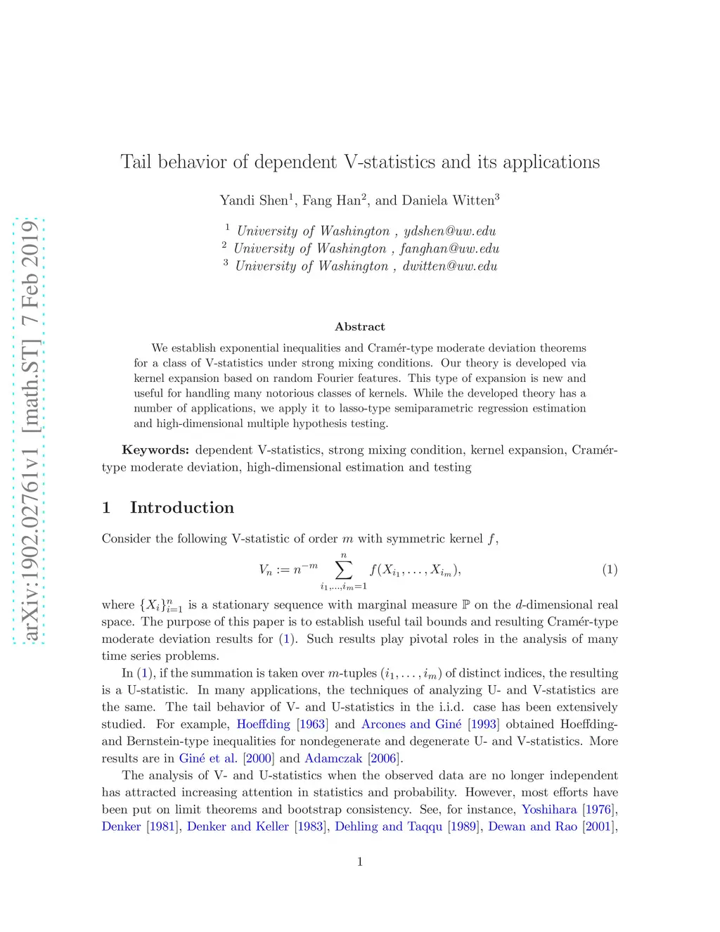 We establish exponential inequalities and Cramer-type moderate deviation theorems for a class of V-statistics under strong mixing conditions. Our theory is developed via kernel expansion based on random Fourier features. This type of expansion is new and useful for handling many notorious classes of kernels. While the developed theory has a number of applications, we apply it to lasso-type semiparametric regression estimation and high-dimensional multiple hypothesis testing.