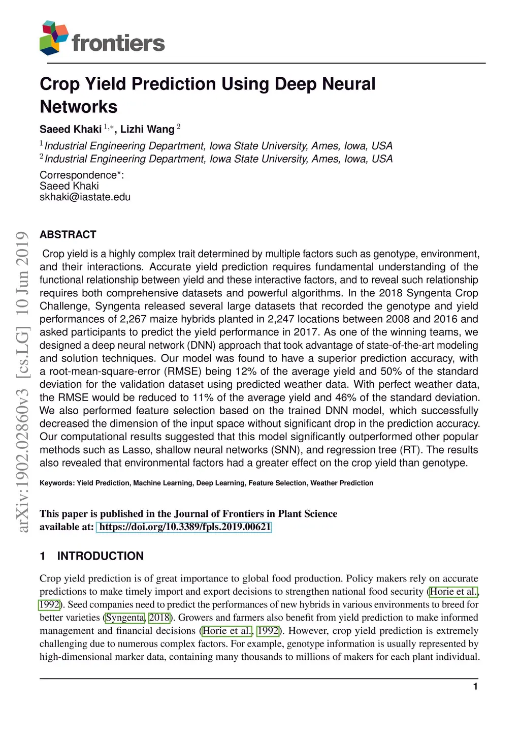 Crop yield is a highly complex trait determined by multiple factors such as genotype, environment, and their interactions. Accurate yield prediction requires fundamental understanding of the functional relationship between yield and these interactive factors, and to reveal such relationship requires both comprehensive datasets and powerful algorithms. In the 2018 Syngenta Crop Challenge, Syngenta released several large datasets that recorded the genotype and yield performances of 2,267 maize hybrids planted in 2,247 locations between 2008 and 2016 and asked participants to predict the yield performance in 2017. As one of the winning teams, we designed a deep neural network (DNN) approach that took advantage of state-of-the-art modeling and solution techniques. Our model was found to have a superior prediction accuracy, with a root-mean-square-error (RMSE) being 12% of the average yield and 50% of the standard deviation for the validation dataset using predicted weather data. With perfect weather data, the RMSE would be reduced to 11% of the average yield and 46% of the standard deviation. We also performed feature selection based on the trained DNN model, which successfully decreased the dimension of the input space without significant drop in the prediction accuracy. Our computational results suggested that this model significantly outperformed other popular methods such as Lasso, shallow neural networks (SNN), and regression tree (RT). The results also revealed that environmental factors had a greater effect on the crop yield than genotype.