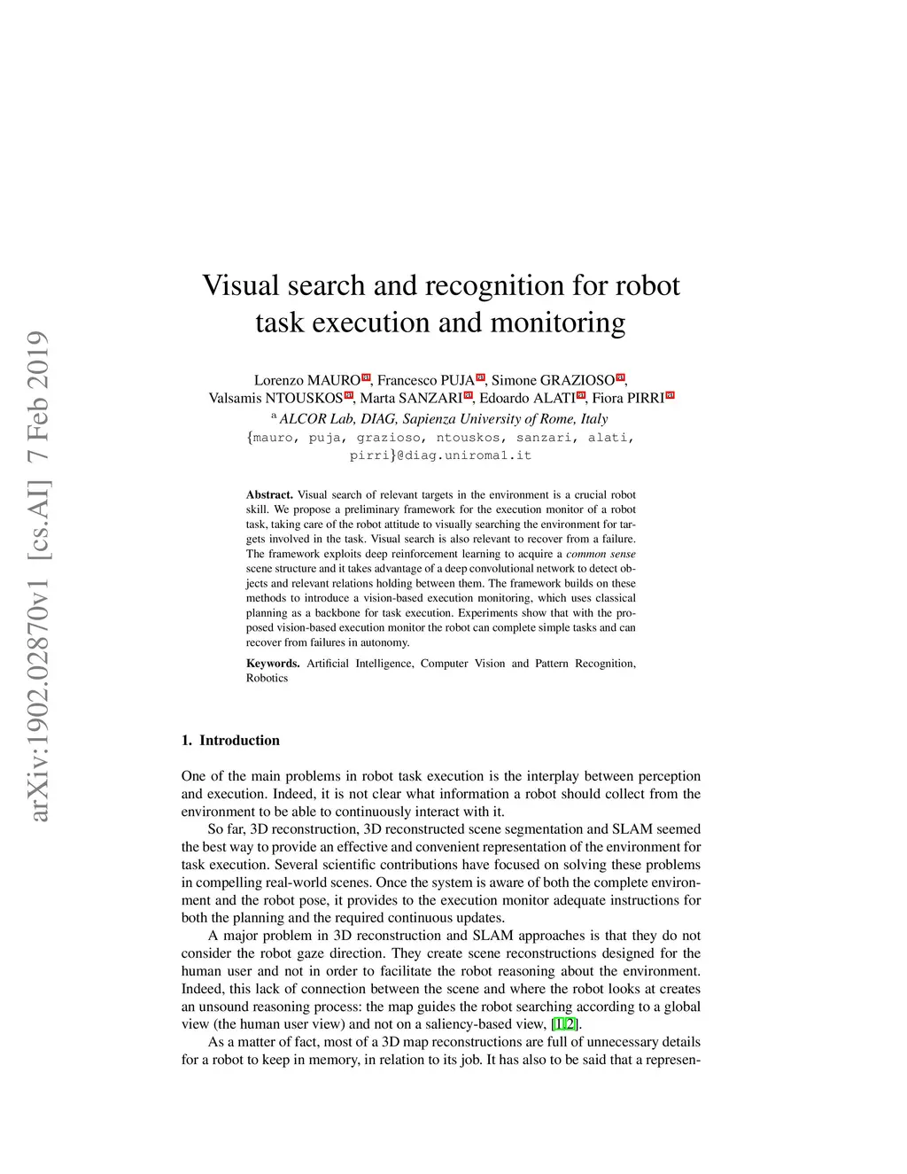 Visual search of relevant targets in the environment is a crucial robot skill. We propose a preliminary framework for the execution monitor of a robot task, taking care of the robot attitude to visually searching the environment for targets involved in the task. Visual search is also relevant to recover from a failure. The framework exploits deep reinforcement learning to acquire a "common sense" scene structure and it takes advantage of a deep convolutional network to detect objects and relevant relations holding between them. The framework builds on these methods to introduce a vision-based execution monitoring, which uses classical planning as a backbone for task execution. Experiments show that with the proposed vision-based execution monitor the robot can complete simple tasks and can recover from failures in autonomy.