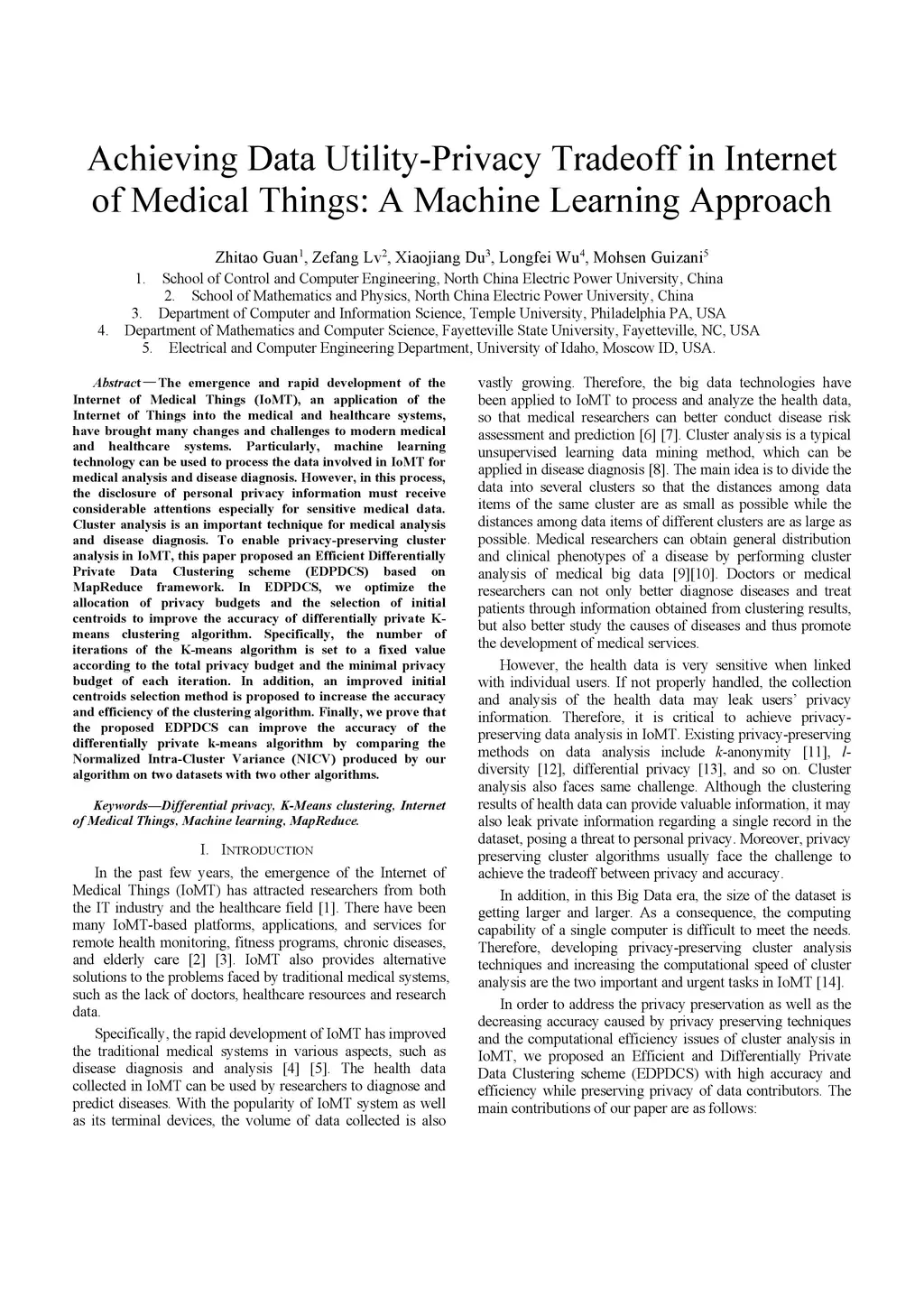 The emergence and rapid development of the Internet of Medical Things (IoMT), an application of the Internet of Things into the medical and healthcare systems, have brought many changes and challenges to modern medical and healthcare systems. Particularly, machine learning technology can be used to process the data involved in IoMT for medical analysis and disease diagnosis. However, in this process, the disclosure of personal privacy information must receive considerable attentions especially for sensitive medical data. Cluster analysis is an important technique for medical analysis and disease diagnosis. To enable privacy-preserving cluster analysis in IoMT, this paper proposed an Efficient Differentially Private Data Clustering scheme (EDPDCS) based on MapReduce framework. In EDPDCS, we optimize the allocation of privacy budgets and the selection of initial centroids to improve the accuracy of differentially private K-means clustering algorithm. Specifically, the number of iterations of the K-means algorithm is set to a fixed value according to the total privacy budget and the minimal privacy budget of each iteration. In addition, an improved initial centroids selection method is proposed to increase the accuracy and efficiency of the clustering algorithm. Finally, we prove that the proposed EDPDCS can improve the accuracy of the differentially private k-means algorithm by comparing the Normalized Intra-Cluster Variance (NICV) produced by our algorithm on two datasets with two other algorithms.