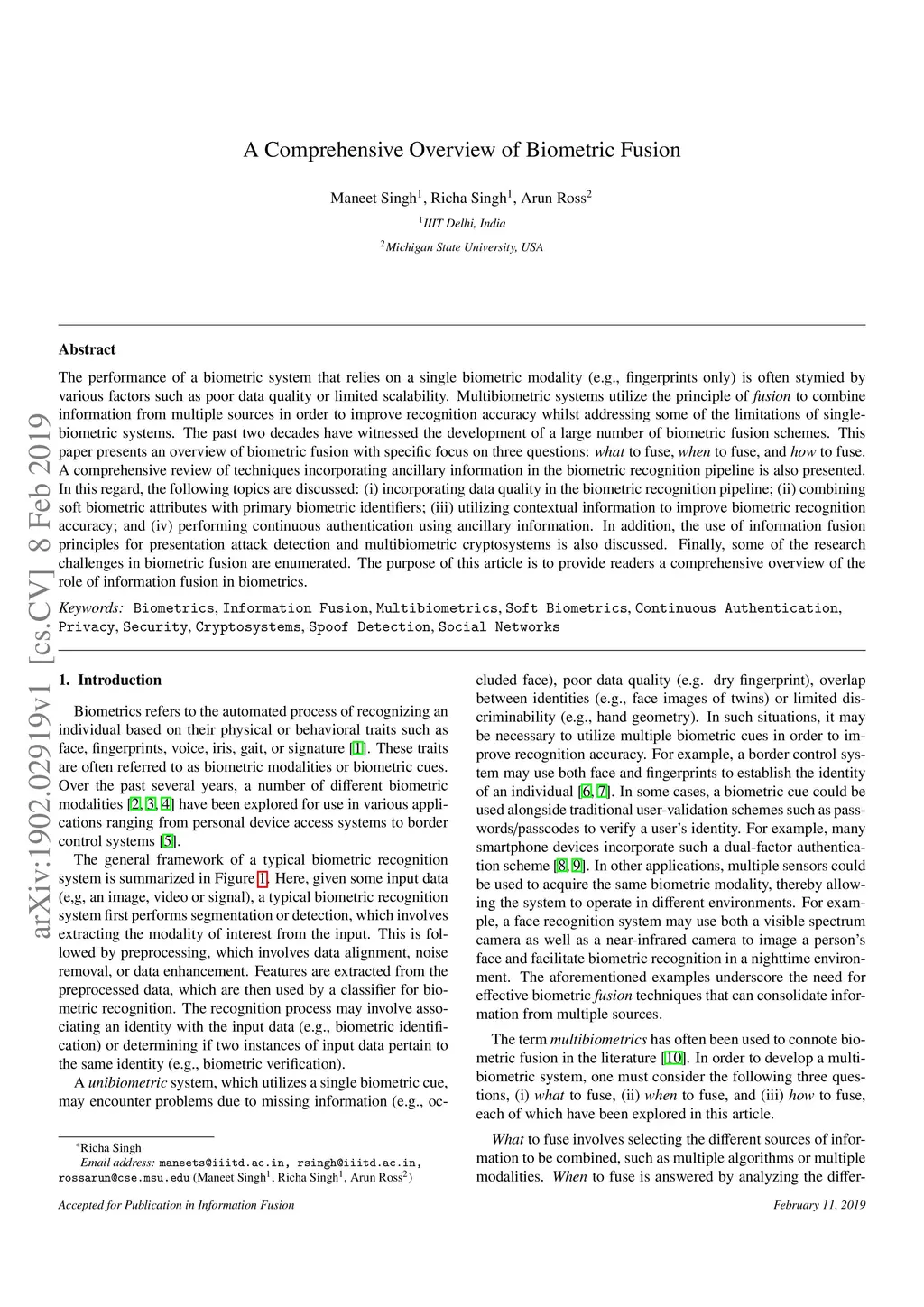 The performance of a biometric system that relies on a single biometric modality (e.g., fingerprints only) is often stymied by various factors such as poor data quality or limited scalability. Multibiometric systems utilize the principle of fusion to combine information from multiple sources in order to improve recognition accuracy whilst addressing some of the limitations of single-biometric systems. The past two decades have witnessed the development of a large number of biometric fusion schemes. This paper presents an overview of biometric fusion with specific focus on three questions: what to fuse, when to fuse, and how to fuse. A comprehensive review of techniques incorporating ancillary information in the biometric recognition pipeline is also presented. In this regard, the following topics are discussed: (i) incorporating data quality in the biometric recognition pipeline; (ii) combining soft biometric attributes with primary biometric identifiers; (iii) utilizing contextual information to improve biometric recognition accuracy; and (iv) performing continuous authentication using ancillary information. In addition, the use of information fusion principles for presentation attack detection and multibiometric cryptosystems is also discussed. Finally, some of the research challenges in biometric fusion are enumerated. The purpose of this article is to provide readers a comprehensive overview of the role of information fusion in biometrics.