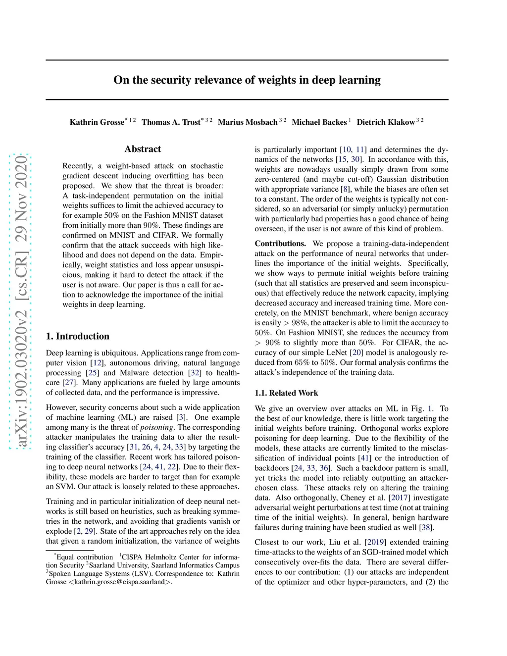 Recently, a weight-based attack on stochastic gradient descent inducing overfitting has been proposed. We show that the threat is broader: A task-independent permutation on the initial weights suffices to limit the achieved accuracy to for example 50% on the Fashion MNIST dataset from initially more than %. These findings are confirmed on MNIST and CIFAR. We formally confirm that the attack succeeds with high likelihood and does not depend on the data. Empirically, weight statistics and loss appear unsuspicious, making it hard to detect the attack if the user is not aware. Our paper is thus a call for action to acknowledge the importance of the initial weights in deep learning.