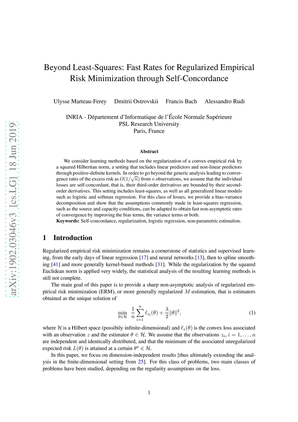 We consider learning methods based on the regularization of a convex empirical risk by a squared Hilbertian norm, a setting that includes linear predictors and non-linear predictors through positive-definite kernels. In order to go beyond the generic analysis leading to convergence rates of the excess risk as from observations, we assume that the individual losses are self-concordant, that is, their third-order derivatives are bounded by their second-order derivatives. This setting includes least-squares, as well as all generalized linear models such as logistic and softmax regression. For this class of losses, we provide a bias-variance decomposition and show that the assumptions commonly made in least-squares regression, such as the source and capacity conditions, can be adapted to obtain fast non-asymptotic rates of convergence by improving the bias terms, the variance terms or both.