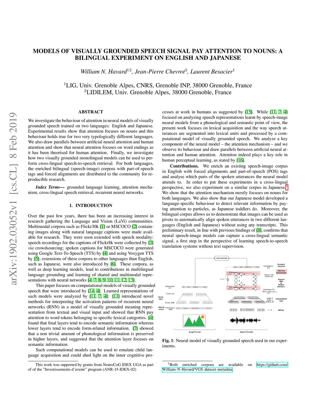 We investigate the behaviour of attention in neural models of visually grounded speech trained on two languages: English and Japanese. Experimental results show that attention focuses on nouns and this behaviour holds true for two very typologically different languages. We also draw parallels between artificial neural attention and human attention and show that neural attention focuses on word endings as it has been theorised for human attention. Finally, we investigate how two visually grounded monolingual models can be used to perform cross-lingual speech-to-speech retrieval. For both languages, the enriched bilingual (speech-image) corpora with part-of-speech tags and forced alignments are distributed to the community for reproducible research.