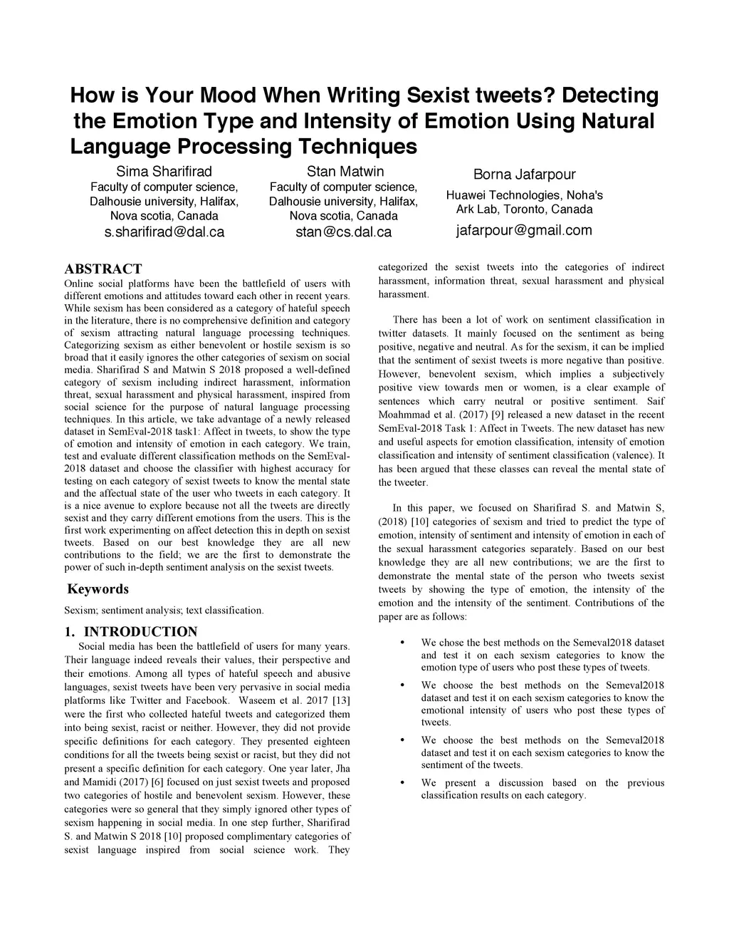Online social platforms have been the battlefield of users with different emotions and attitudes toward each other in recent years. While sexism has been considered as a category of hateful speech in the literature, there is no comprehensive definition and category of sexism attracting natural language processing techniques. Categorizing sexism as either benevolent or hostile sexism is so broad that it easily ignores the other categories of sexism on social media. Sharifirad S and Matwin S 2018 proposed a well-defined category of sexism including indirect harassment, information threat, sexual harassment and physical harassment, inspired from social science for the purpose of natural language processing techniques. In this article, we take advantage of a newly released dataset in SemEval-2018 task1: Affect in tweets, to show the type of emotion and intensity of emotion in each category. We train, test and evaluate different classification methods on the SemEval- 2018 dataset and choose the classifier with highest accuracy for testing on each category of sexist tweets to know the mental state and the affectual state of the user who tweets in each category. It is a nice avenue to explore because not all the tweets are directly sexist and they carry different emotions from the users. This is the first work experimenting on affect detection this in depth on sexist tweets. Based on our best knowledge they are all new contributions to the field; we are the first to demonstrate the power of such in-depth sentiment analysis on the sexist tweets.