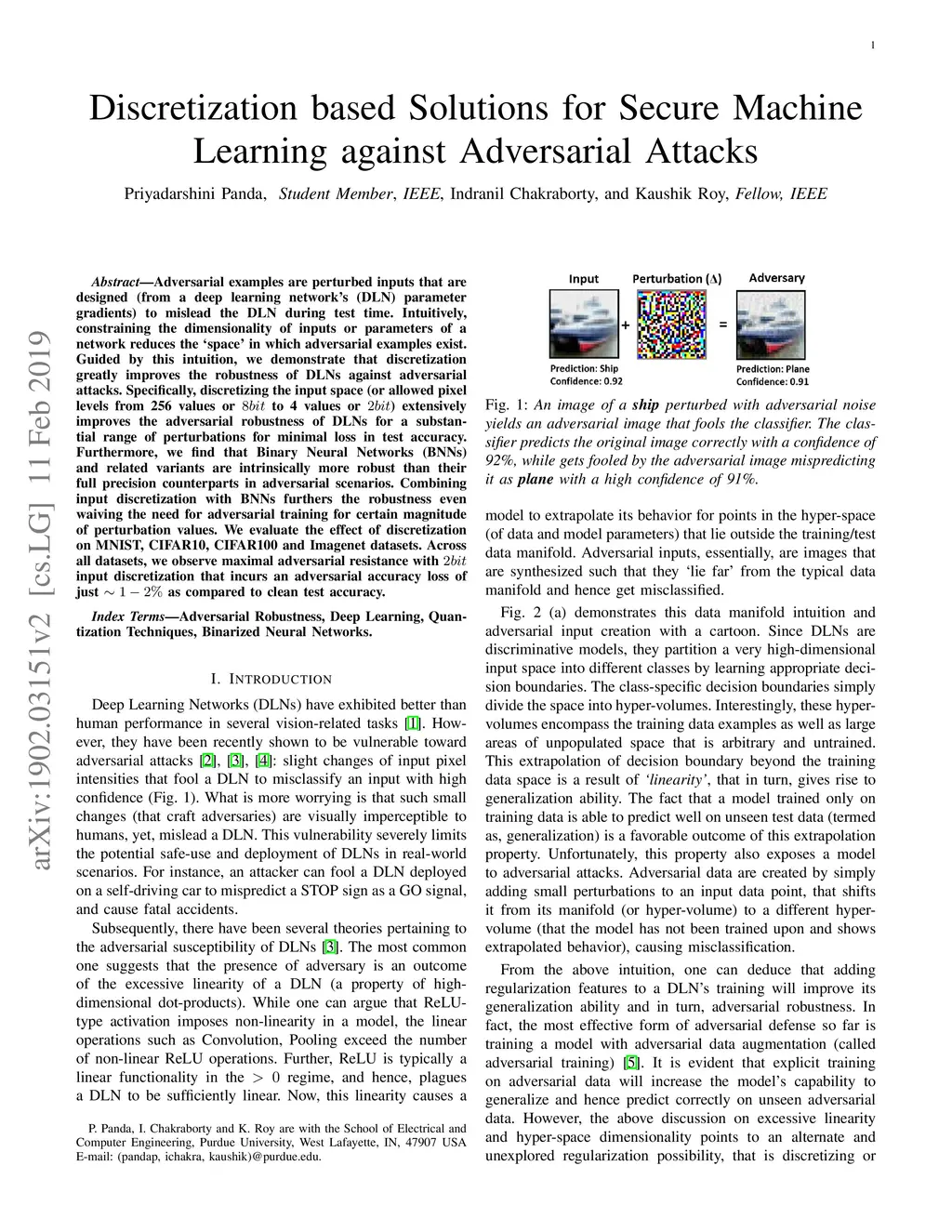 Adversarial examples are perturbed inputs that are designed (from a deep learning network's (DLN) parameter gradients) to mislead the DLN during test time. Intuitively, constraining the dimensionality of inputs or parameters of a network reduces the 'space' in which adversarial examples exist. Guided by this intuition, we demonstrate that discretization greatly improves the robustness of DLNs against adversarial attacks. Specifically, discretizing the input space (or allowed pixel levels from 256 values or 8-bit to 4 values or 2-bit) extensively improves the adversarial robustness of DLNs for a substantial range of perturbations for minimal loss in test accuracy. Furthermore, we find that Binary Neural Networks (BNNs) and related variants are intrinsically more robust than their full precision counterparts in adversarial scenarios. Combining input discretization with BNNs furthers the robustness even waiving the need for adversarial training for certain magnitude of perturbation values. We evaluate the effect of discretization on MNIST, CIFAR10, CIFAR100 and Imagenet datasets. Across all datasets, we observe maximal adversarial resistance with 2-bit input discretization that incurs an adversarial accuracy loss of just ~1-2% as compared to clean test accuracy.