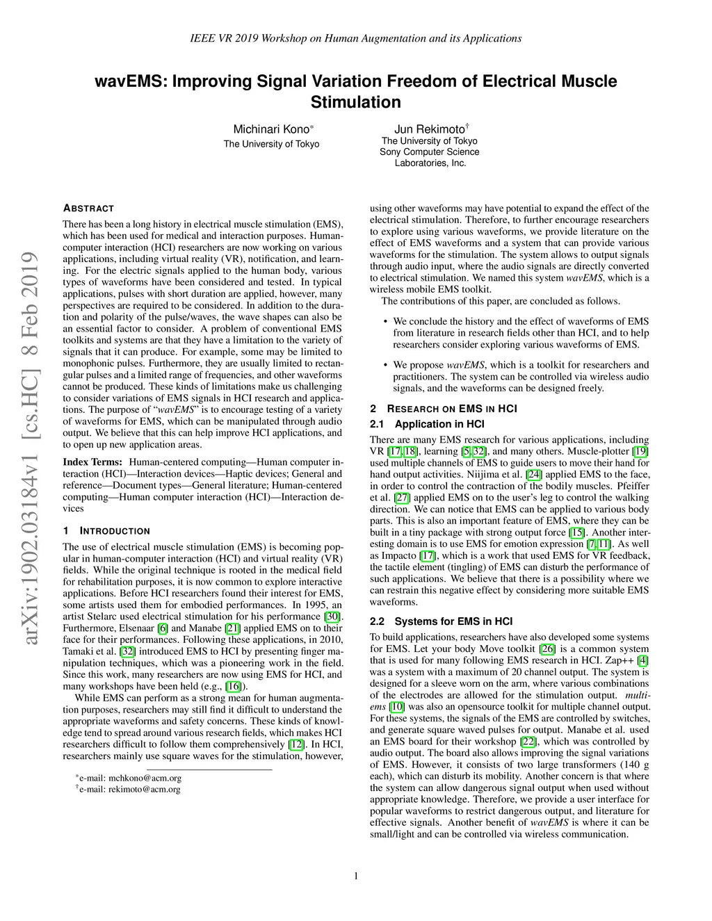 There has been a long history in electrical muscle stimulation (EMS), which has been used for medical and interaction purposes. Human-computer interaction (HCI) researchers are now working on various applications, including virtual reality (VR), notification, and learning. For the electric signals applied to the human body, various types of waveforms have been considered and tested. In typical applications, pulses with short duration are applied, however, many perspectives are required to be considered. In addition to the duration and polarity of the pulse/waves, the wave shapes can also be an essential factor to consider. A problem of conventional EMS toolkits and systems are that they have a limitation to the variety of signals that it can produce. For example, some may be limited to monophonic pulses. Furthermore, they are usually limited to rectangular pulses and a limited range of frequencies, and other waveforms cannot be produced. These kinds of limitations make us challenging to consider variations of EMS signals in HCI research and applications. The purpose of "{\it wavEMS}" is to encourage testing of a variety of waveforms for EMS, which can be manipulated through audio output. We believe that this can help improve HCI applications, and to open up new application areas.