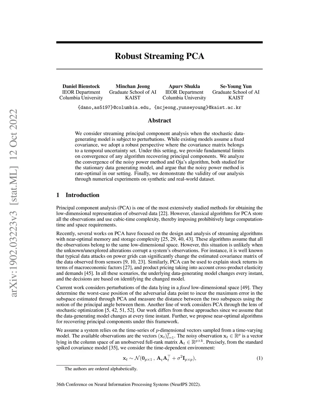 We consider streaming principal component analysis when the stochastic data-generating model is subject to perturbations. While existing models assume a fixed covariance, we adopt a robust perspective where the covariance matrix belongs to a temporal uncertainty set. Under this setting, we provide fundamental limits on convergence of any algorithm recovering principal components. We analyze the convergence of the noisy power method and Oja's algorithm, both studied for the stationary data generating model, and argue that the noisy power method is rate-optimal in our setting. Finally, we demonstrate the validity of our analysis through numerical experiments on synthetic and real-world dataset.