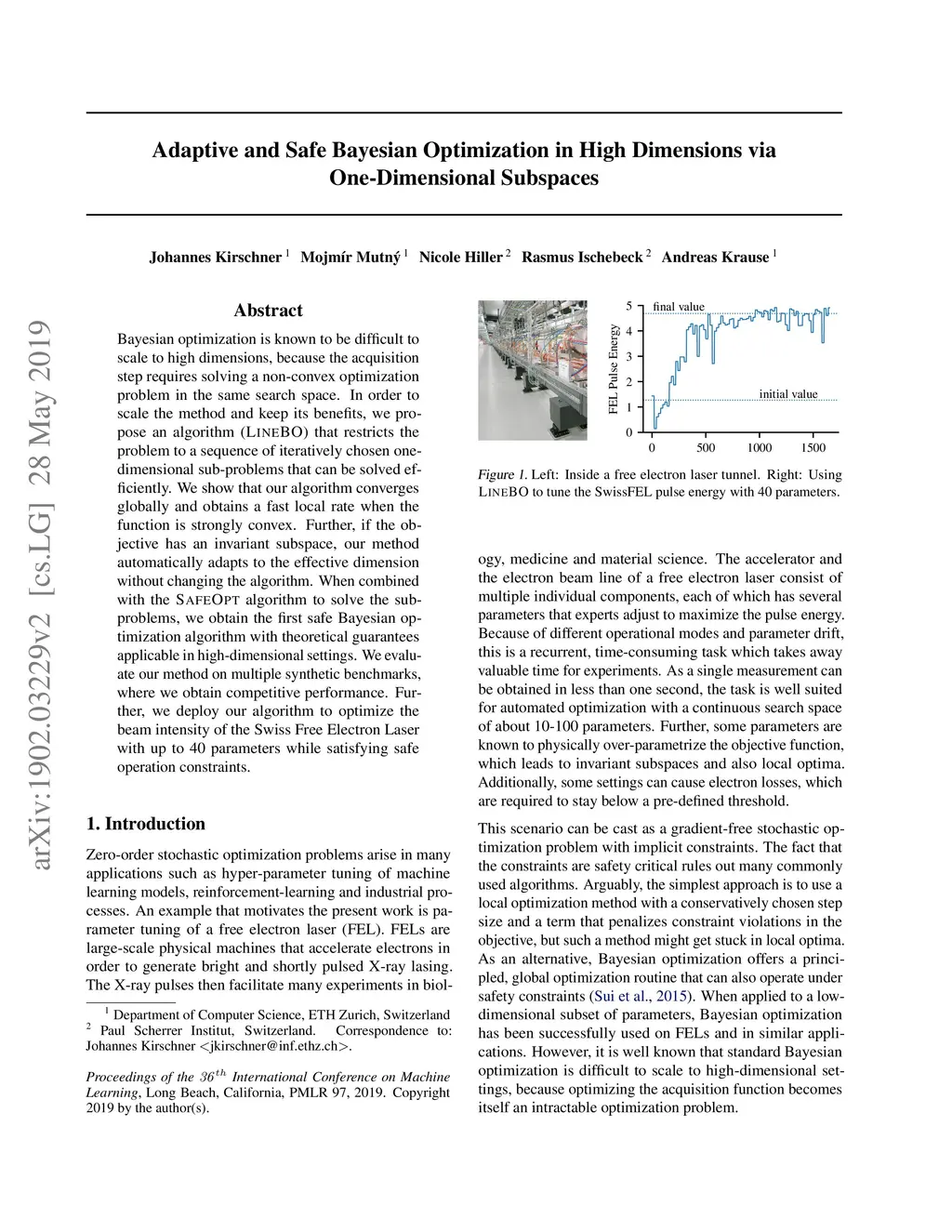Bayesian optimization is known to be difficult to scale to high dimensions, because the acquisition step requires solving a non-convex optimization problem in the same search space. In order to scale the method and keep its benefits, we propose an algorithm (LineBO) that restricts the problem to a sequence of iteratively chosen one-dimensional sub-problems that can be solved efficiently. We show that our algorithm converges globally and obtains a fast local rate when the function is strongly convex. Further, if the objective has an invariant subspace, our method automatically adapts to the effective dimension without changing the algorithm. When combined with the SafeOpt algorithm to solve the sub-problems, we obtain the first safe Bayesian optimization algorithm with theoretical guarantees applicable in high-dimensional settings. We evaluate our method on multiple synthetic benchmarks, where we obtain competitive performance. Further, we deploy our algorithm to optimize the beam intensity of the Swiss Free Electron Laser with up to 40 parameters while satisfying safe operation constraints.