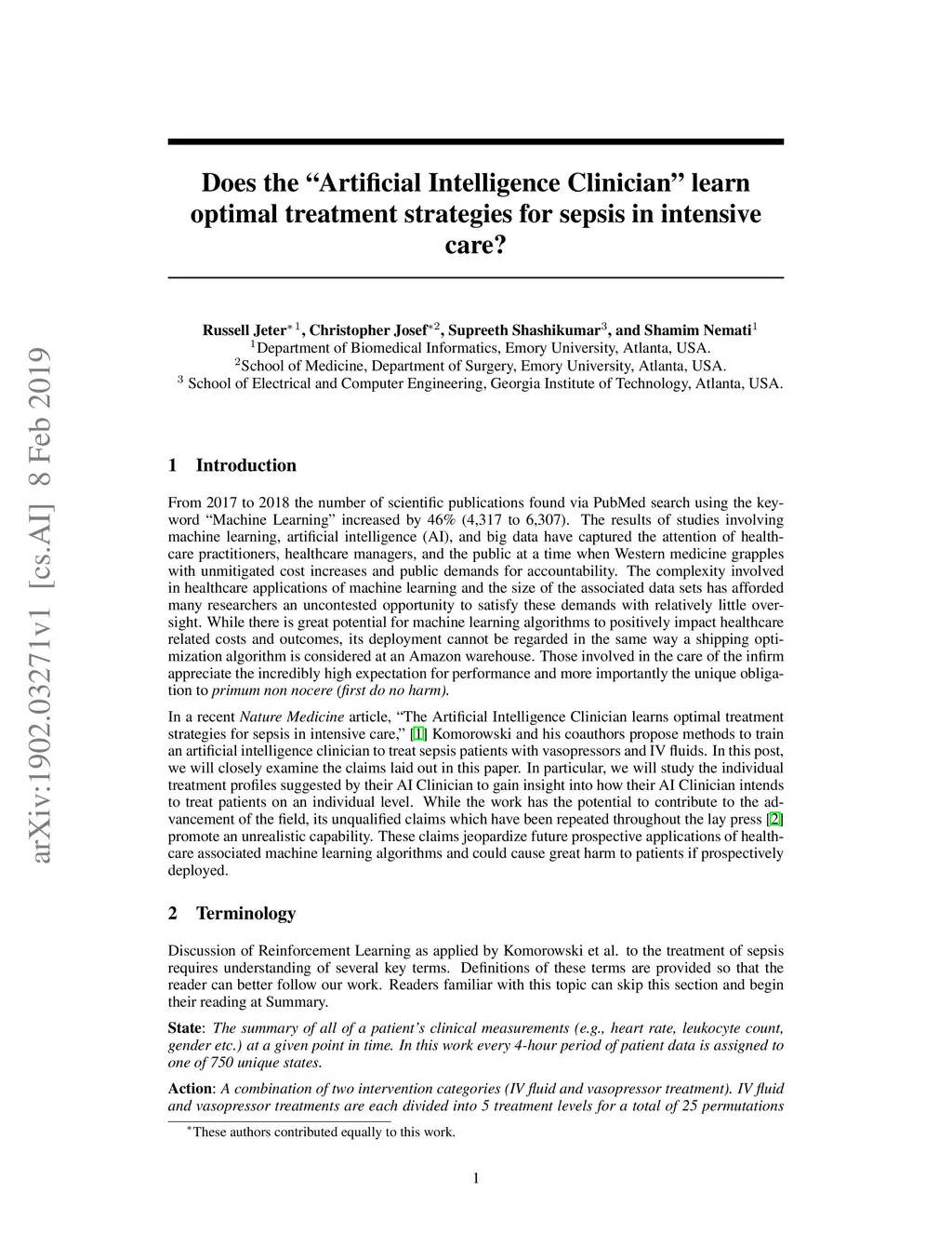 From 2017 to 2018 the number of scientific publications found via PubMed search using the keyword "Machine Learning" increased by 46% (4,317 to 6,307). The results of studies involving machine learning, artificial intelligence (AI), and big data have captured the attention of healthcare practitioners, healthcare managers, and the public at a time when Western medicine grapples with unmitigated cost increases and public demands for accountability. The complexity involved in healthcare applications of machine learning and the size of the associated data sets has afforded many researchers an uncontested opportunity to satisfy these demands with relatively little oversight. In a recent Nature Medicine article, "The Artificial Intelligence Clinician learns optimal treatment strategies for sepsis in intensive care," Komorowski and his coauthors propose methods to train an artificial intelligence clinician to treat sepsis patients with vasopressors and IV fluids. In this post, we will closely examine the claims laid out in this paper. In particular, we will study the individual treatment profiles suggested by their AI Clinician to gain insight into how their AI Clinician intends to treat patients on an individual level.