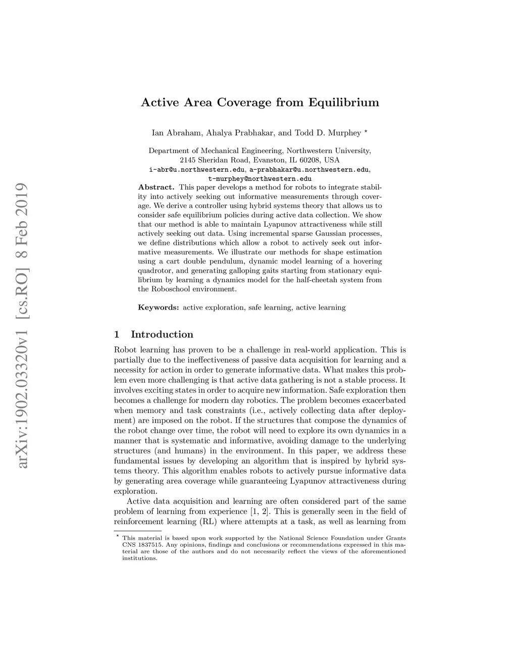 This paper develops a method for robots to integrate stability into actively seeking out informative measurements through coverage. We derive a controller using hybrid systems theory that allows us to consider safe equilibrium policies during active data collection. We show that our method is able to maintain Lyapunov attractiveness while still actively seeking out data. Using incremental sparse Gaussian processes, we define distributions which allow a robot to actively seek out informative measurements. We illustrate our methods for shape estimation using a cart double pendulum, dynamic model learning of a hovering quadrotor, and generating galloping gaits starting from stationary equilibrium by learning a dynamics model for the half-cheetah system from the Roboschool environment.