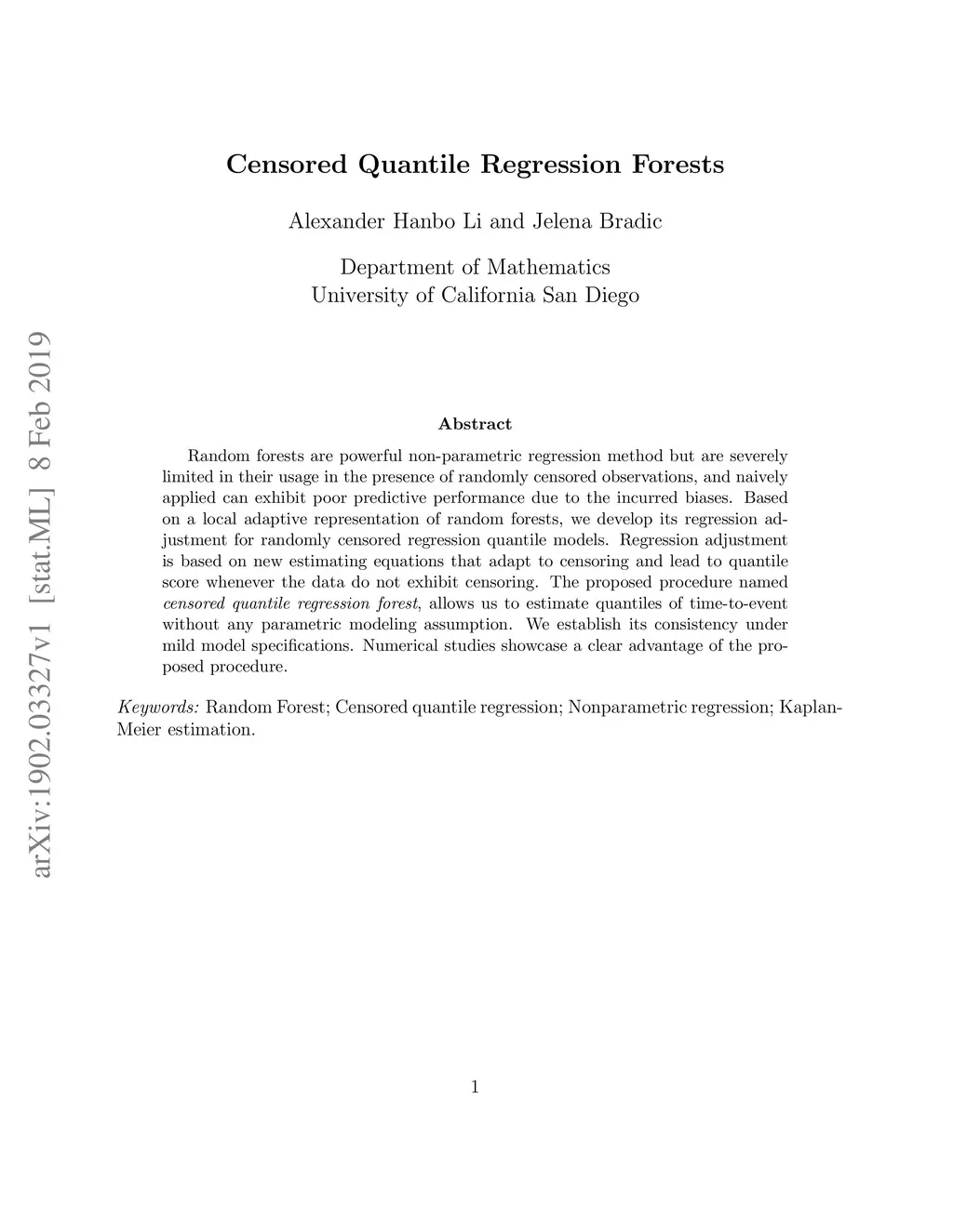 Random forests are powerful non-parametric regression method but are severely limited in their usage in the presence of randomly censored observations, and naively applied can exhibit poor predictive performance due to the incurred biases. Based on a local adaptive representation of random forests, we develop its regression adjustment for randomly censored regression quantile models. Regression adjustment is based on new estimating equations that adapt to censoring and lead to quantile score whenever the data do not exhibit censoring. The proposed procedure named censored quantile regression forest, allows us to estimate quantiles of time-to-event without any parametric modeling assumption. We establish its consistency under mild model specifications. Numerical studies showcase a clear advantage of the proposed procedure.