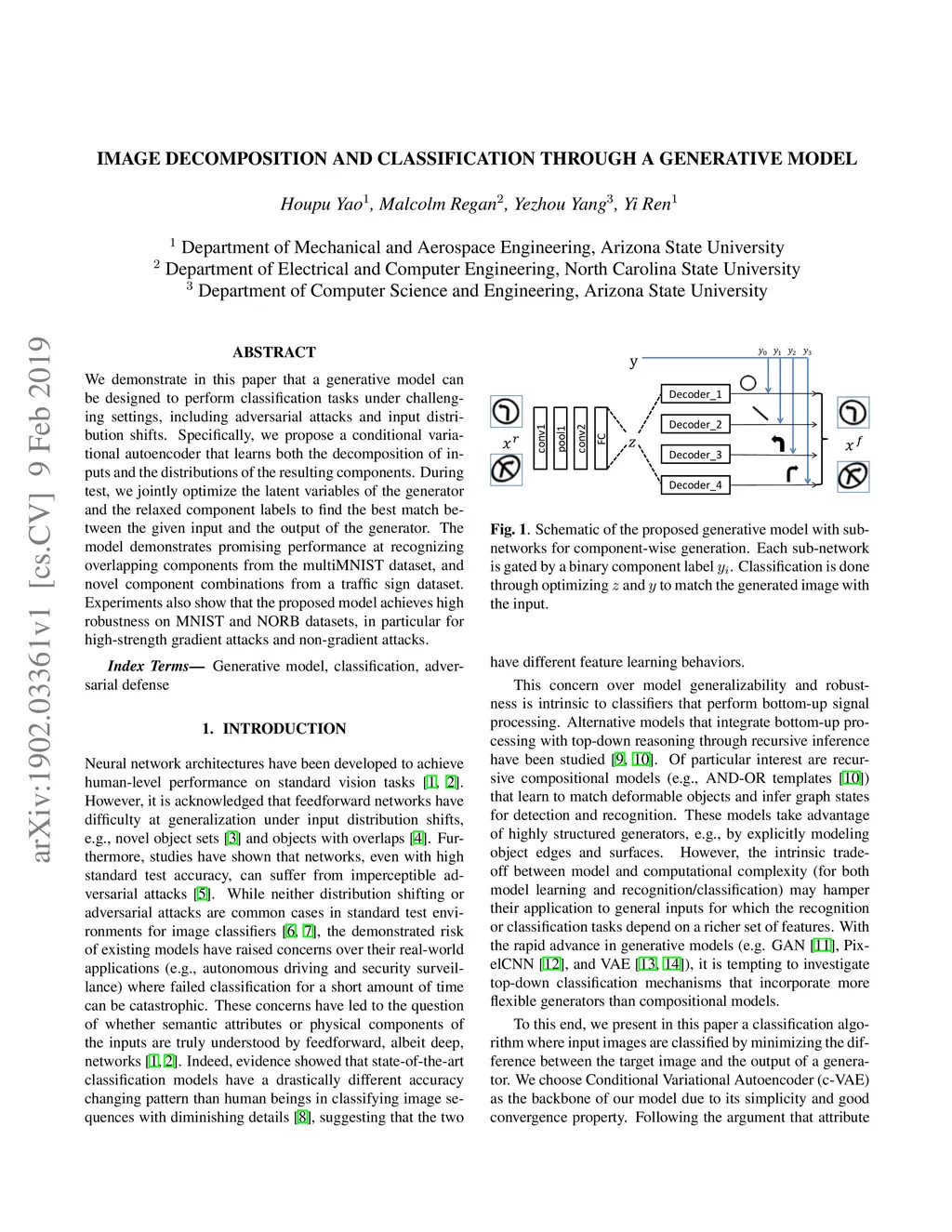 We demonstrate in this paper that a generative model can be designed to perform classification tasks under challenging settings, including adversarial attacks and input distribution shifts. Specifically, we propose a conditional variational autoencoder that learns both the decomposition of inputs and the distributions of the resulting components. During test, we jointly optimize the latent variables of the generator and the relaxed component labels to find the best match between the given input and the output of the generator. The model demonstrates promising performance at recognizing overlapping components from the multiMNIST dataset, and novel component combinations from a traffic sign dataset. Experiments also show that the proposed model achieves high robustness on MNIST and NORB datasets, in particular for high-strength gradient attacks and non-gradient attacks.