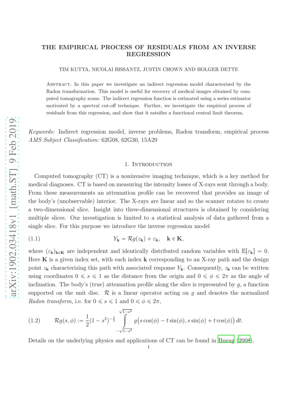 In this paper we investigate an indirect regression model characterized by the Radon transformation. This model is useful for recovery of medical images obtained by computed tomography scans. The indirect regression function is estimated using a series estimator motivated by a spectral cut-off technique. Further, we investigate the empirical process of residuals from this regression, and show that it satsifies a functional central limit theorem.