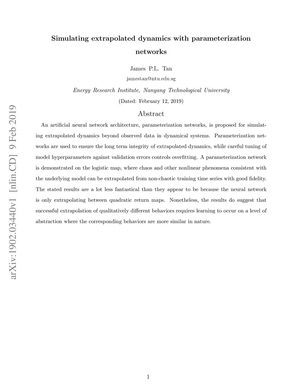 An artificial neural network architecture, parameterization networks, is proposed for simulating extrapolated dynamics beyond observed data in dynamical systems. Parameterization networks are used to ensure the long term integrity of extrapolated dynamics, while careful tuning of model hyperparameters against validation errors controls overfitting. A parameterization network is demonstrated on the logistic map, where chaos and other nonlinear phenomena consistent with the underlying model can be extrapolated from non-chaotic training time series with good fidelity. The stated results are a lot less fantastical than they appear to be because the neural network is only extrapolating between quadratic return maps. Nonetheless, the results do suggest that successful extrapolation of qualitatively different behaviors requires learning to occur on a level of abstraction where the corresponding behaviors are more similar in nature.