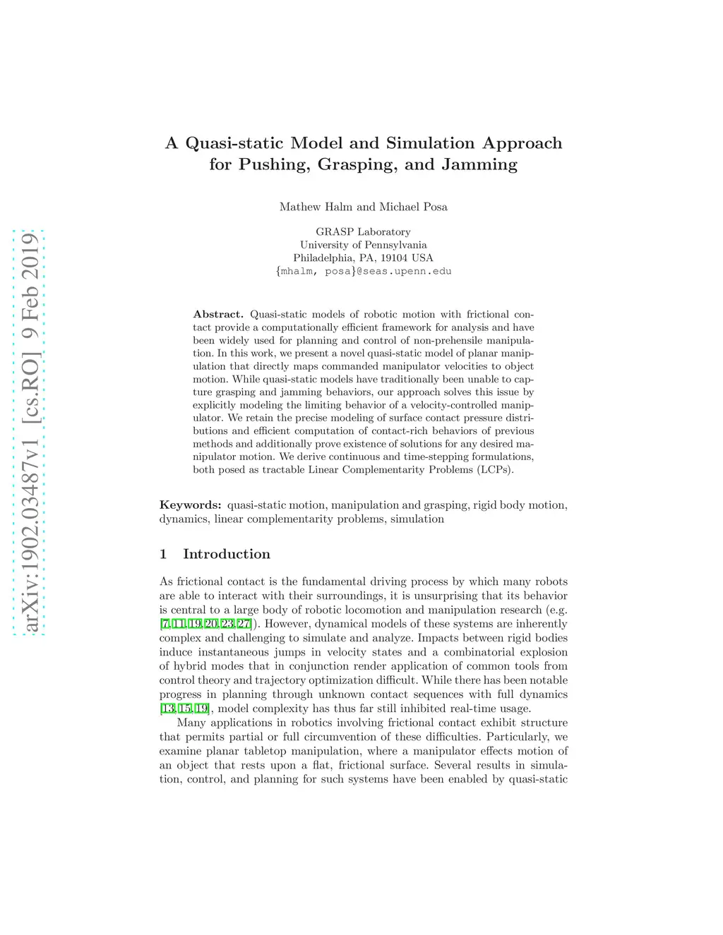 A Quasi-static Model and Simulation Approach for Pushing, Grasping, and