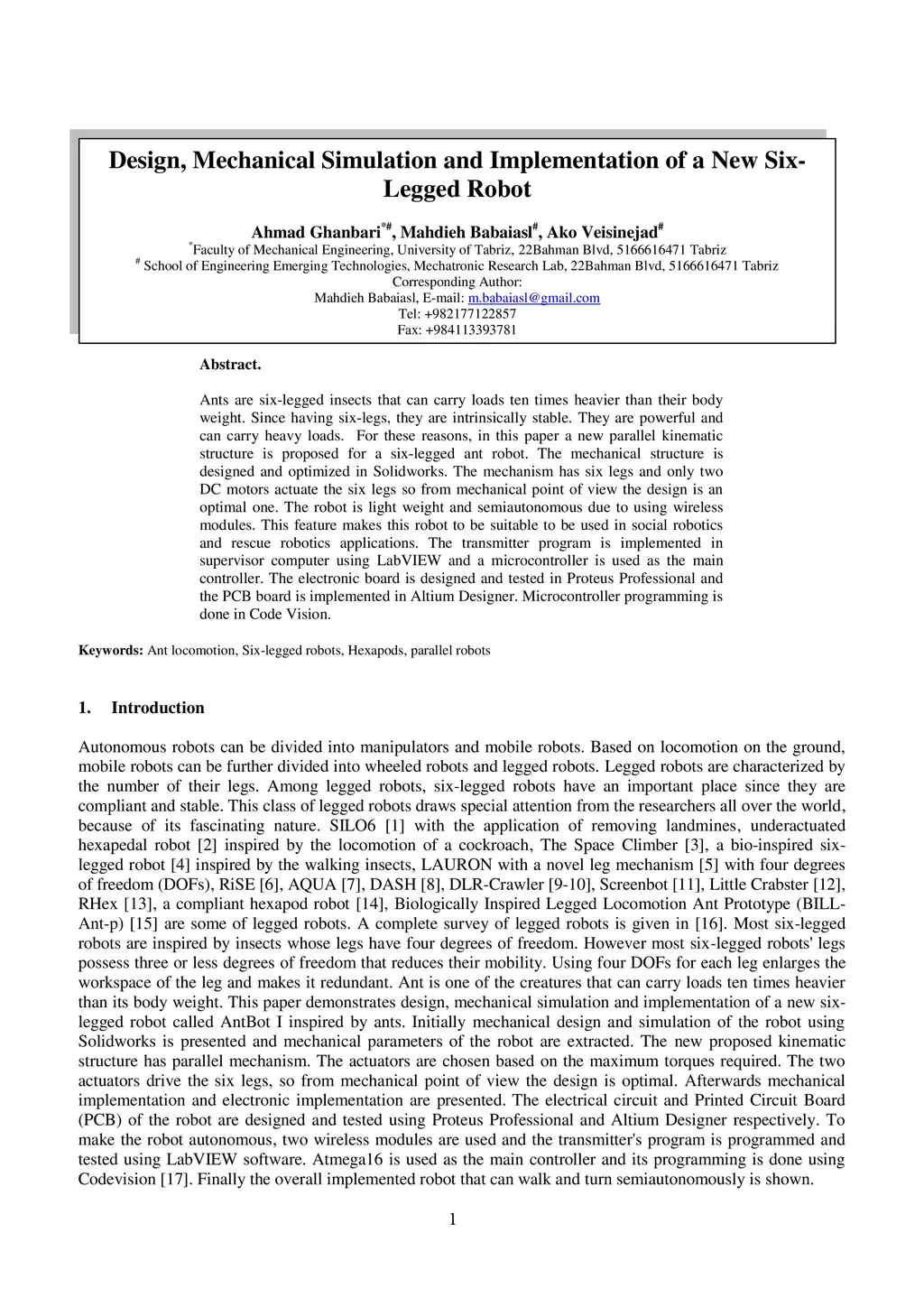 Design, Mechanical Simulation and Implementation of a New Six- Legged