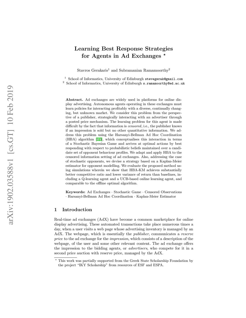 Ad exchanges are widely used in platforms for online display advertising. Autonomous agents operating in these exchanges must learn policies for interacting profitably with a diverse, continually changing, but unknown market. We consider this problem from the perspective of a publisher, strategically interacting with an advertiser through a posted price mechanism. The learning problem for this agent is made difficult by the fact that information is censored, i.e., the publisher knows if an impression is sold but no other quantitative information. We address this problem using the Harsanyi-Bellman Ad Hoc Coordination (HBA) algorithm, which conceptualises this interaction in terms of a Stochastic Bayesian Game and arrives at optimal actions by best responding with respect to probabilistic beliefs maintained over a candidate set of opponent behaviour profiles. We adapt and apply HBA to the censored information setting of ad exchanges. Also, addressing the case of stochastic opponents, we devise a strategy based on a Kaplan-Meier estimator for opponent modelling. We evaluate the proposed method using simulations wherein we show that HBA-KM achieves substantially better competitive ratio and lower variance of return than baselines, including a Q-learning agent and a UCB-based online learning agent, and comparable to the offline optimal algorithm.
