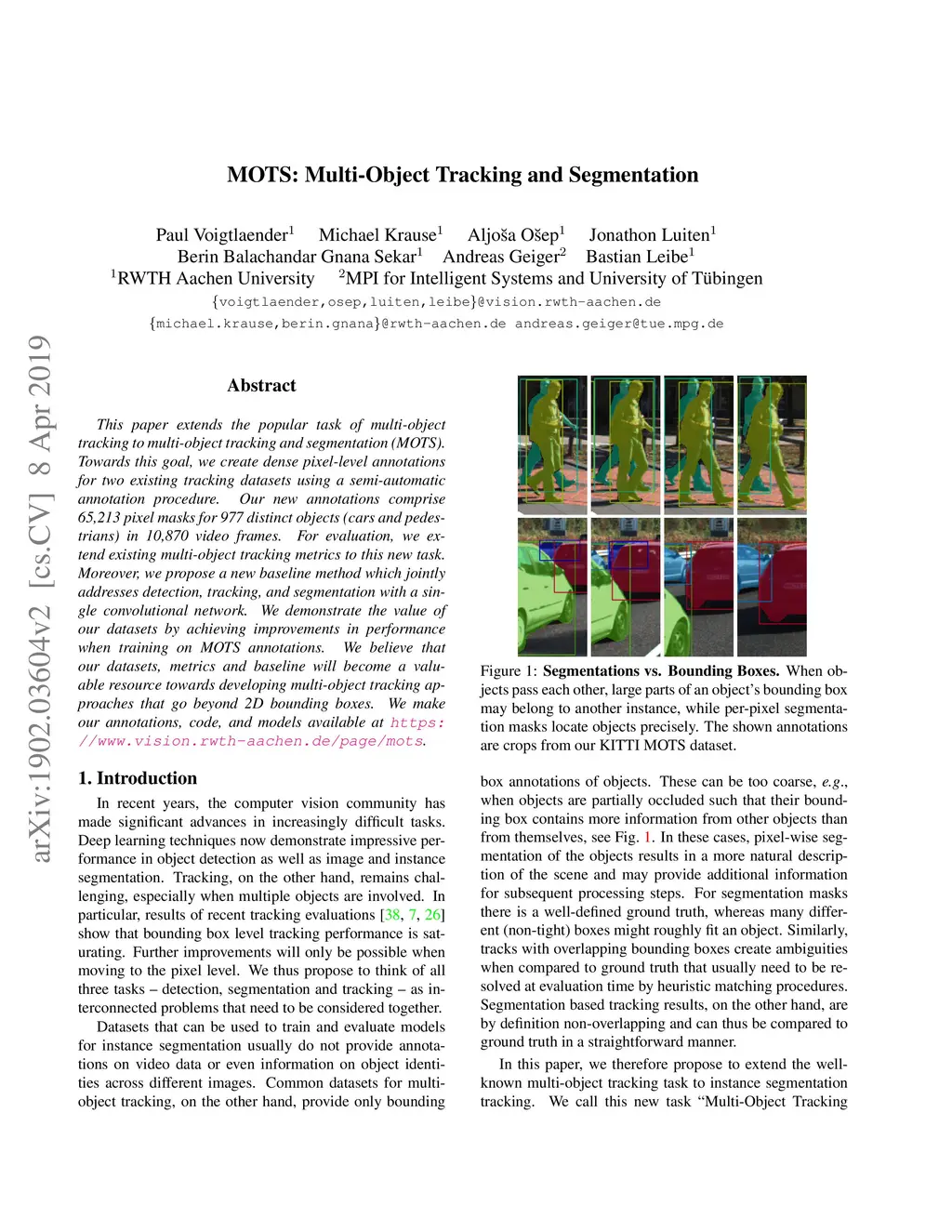 This paper extends the popular task of multi-object tracking to multi-object tracking and segmentation (MOTS). Towards this goal, we create dense pixel-level annotations for two existing tracking datasets using a semi-automatic annotation procedure. Our new annotations comprise 65,213 pixel masks for 977 distinct objects (cars and pedestrians) in 10,870 video frames. For evaluation, we extend existing multi-object tracking metrics to this new task. Moreover, we propose a new baseline method which jointly addresses detection, tracking, and segmentation with a single convolutional network. We demonstrate the value of our datasets by achieving improvements in performance when training on MOTS annotations. We believe that our datasets, metrics and baseline will become a valuable resource towards developing multi-object tracking approaches that go beyond 2D bounding boxes. We make our annotations, code, and models available at https://www.vision.rwth-aachen.de/page/mots.
