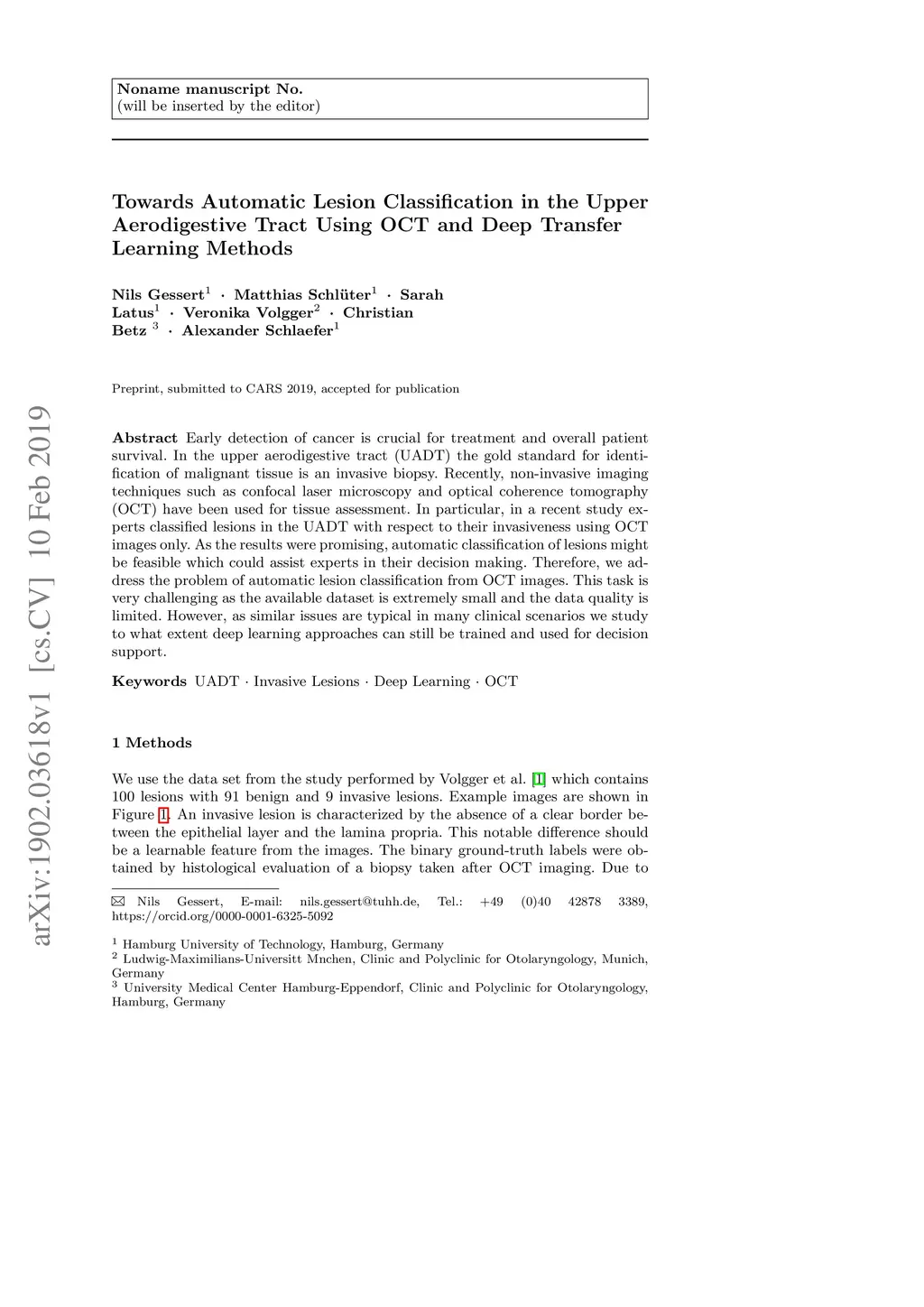 Early detection of cancer is crucial for treatment and overall patient survival. In the upper aerodigestive tract (UADT) the gold standard for identification of malignant tissue is an invasive biopsy. Recently, non-invasive imaging techniques such as confocal laser microscopy and optical coherence tomography (OCT) have been used for tissue assessment. In particular, in a recent study experts classified lesions in the UADT with respect to their invasiveness using OCT images only. As the results were promising, automatic classification of lesions might be feasible which could assist experts in their decision making. Therefore, we address the problem of automatic lesion classification from OCT images. This task is very challenging as the available dataset is extremely small and the data quality is limited. However, as similar issues are typical in many clinical scenarios we study to what extent deep learning approaches can still be trained and used for decision support.