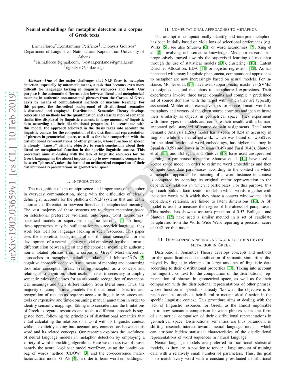 Neural embeddings for metaphor detection in a corpus of Greek texts