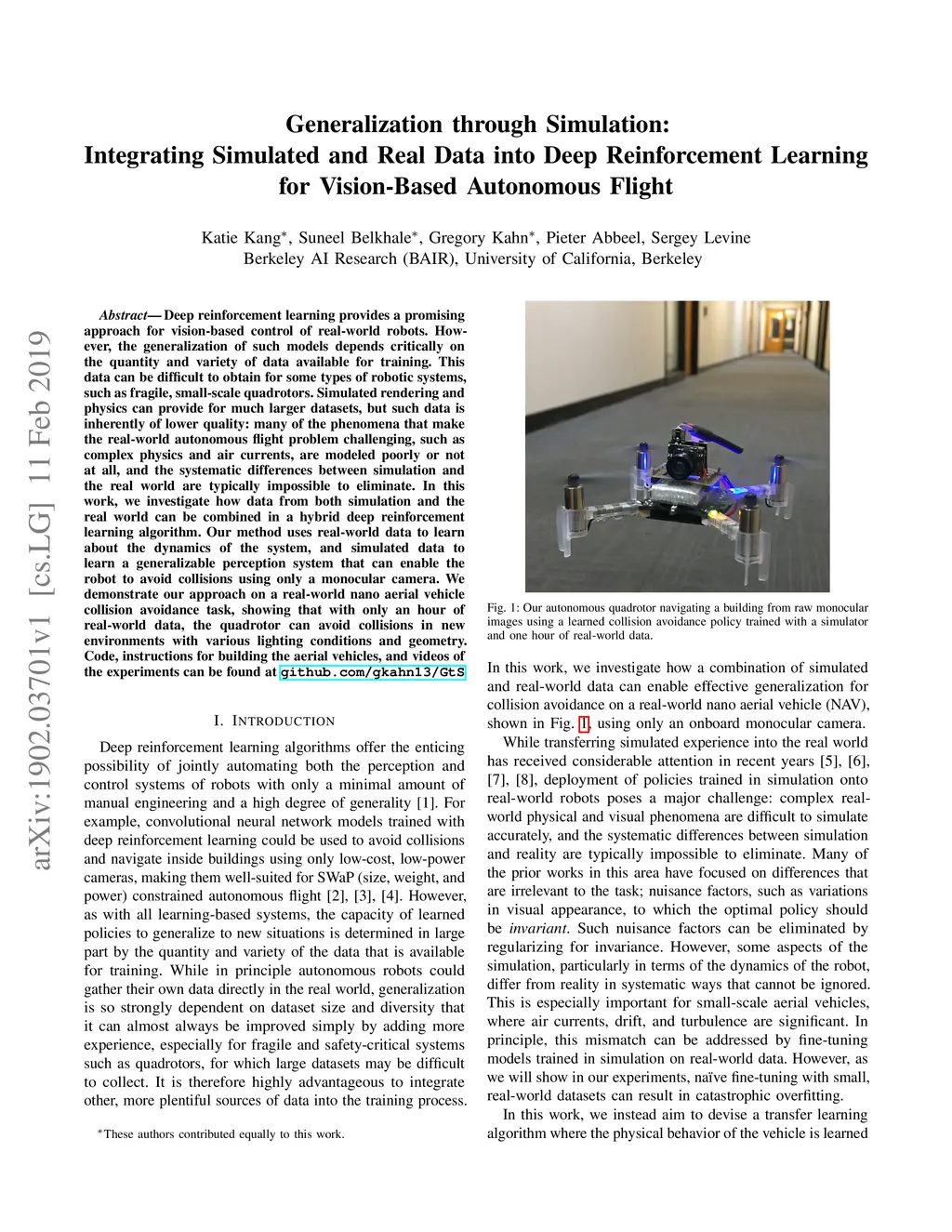 Deep reinforcement learning provides a promising approach for vision-based control of real-world robots. However, the generalization of such models depends critically on the quantity and variety of data available for training. This data can be difficult to obtain for some types of robotic systems, such as fragile, small-scale quadrotors. Simulated rendering and physics can provide for much larger datasets, but such data is inherently of lower quality: many of the phenomena that make the real-world autonomous flight problem challenging, such as complex physics and air currents, are modeled poorly or not at all, and the systematic differences between simulation and the real world are typically impossible to eliminate. In this work, we investigate how data from both simulation and the real world can be combined in a hybrid deep reinforcement learning algorithm. Our method uses real-world data to learn about the dynamics of the system, and simulated data to learn a generalizable perception system that can enable the robot to avoid collisions using only a monocular camera. We demonstrate our approach on a real-world nano aerial vehicle collision avoidance task, showing that with only an hour of real-world data, the quadrotor can avoid collisions in new environments with various lighting conditions and geometry. Code, instructions for building the aerial vehicles, and videos of the experiments can be found at github.com/gkahn13/GtS