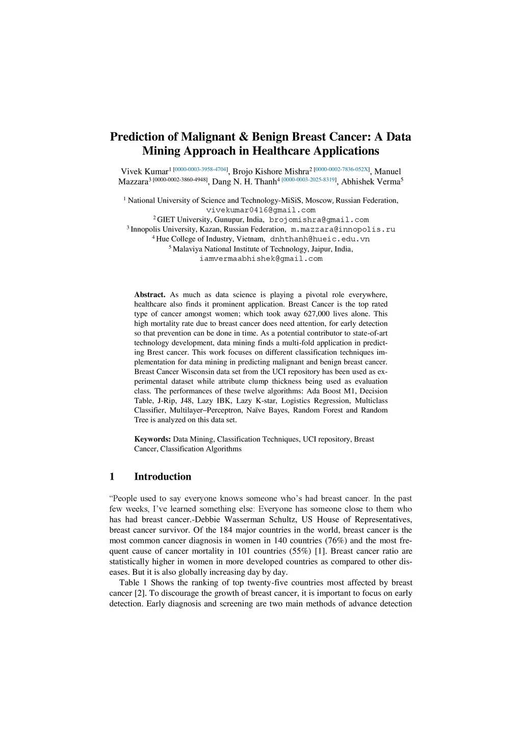 Prediction of Malignant & Benign Breast Cancer: A Data Mining Approach in Healthcare Applications