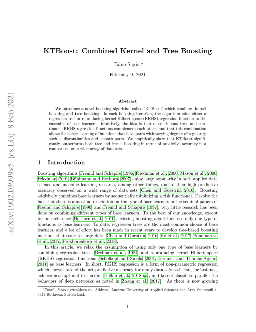 In this article, we introduce a novel boosting algorithm called `KTBoost', which combines kernel boosting and tree boosting. In each boosting iteration, the algorithm adds either a regression tree or reproducing kernel Hilbert space (RKHS) regression function to the ensemble of base learners. Intuitively, the idea is that discontinuous trees and continuous RKHS regression functions complement each other, and that this combination allows for better learning of functions that have parts with varying degrees of regularity such as discontinuities and smooth parts. We empirically show that KTBoost outperforms both tree and kernel boosting in terms of predictive accuracy on a wide array of data sets.