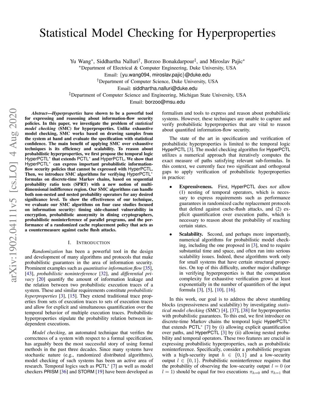 Hyperproperties have shown to be a powerful tool for expressing and reasoning about information-flow security policies. In this paper, we investigate the problem of statistical model checking (SMC) for hyperproperties. Unlike exhaustive model checking, SMC works based on drawing samples from the system at hand and evaluate the specification with statistical confidence. The main benefit of applying SMC over exhaustive techniques is its efficiency and scalability. To reason about probabilistic hyperproperties, we first propose the temporal logic HyperPCLT* that extends PCTL* and HyperPCTL. We show that HyperPCLT* can express important probabilistic information-flow security policies that cannot be expressed with HyperPCTL. Then, we introduce SMC algorithms for verifying HyperPCLT* formulas on discrete-time Markov chains, based on sequential probability ratio tests (SPRT) with a new notion of multi-dimensional indifference region. Our SMC algorithms can handle both non-nested and nested probability operators for any desired significance level. To show the effectiveness of our technique, we evaluate our SMC algorithms on four case studies focused on information security: timing side-channel vulnerability in encryption, probabilistic anonymity in dining cryptographers, probabilistic noninterference of parallel programs, and the performance of a randomized cache replacement policy that acts as a countermeasure against cache flush attacks.
