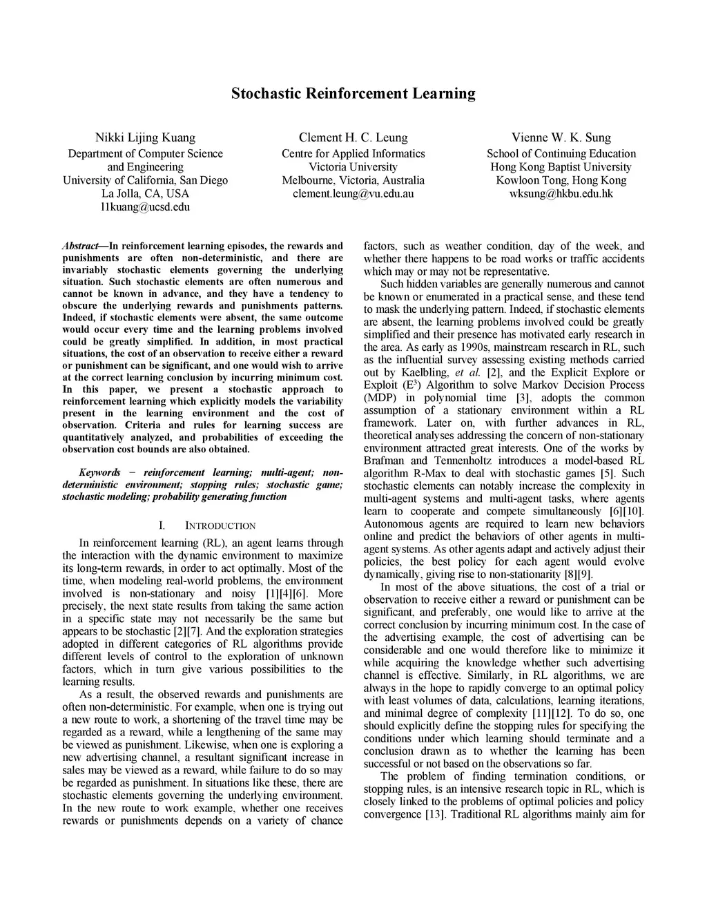 Stochastic Reinforcement Learning