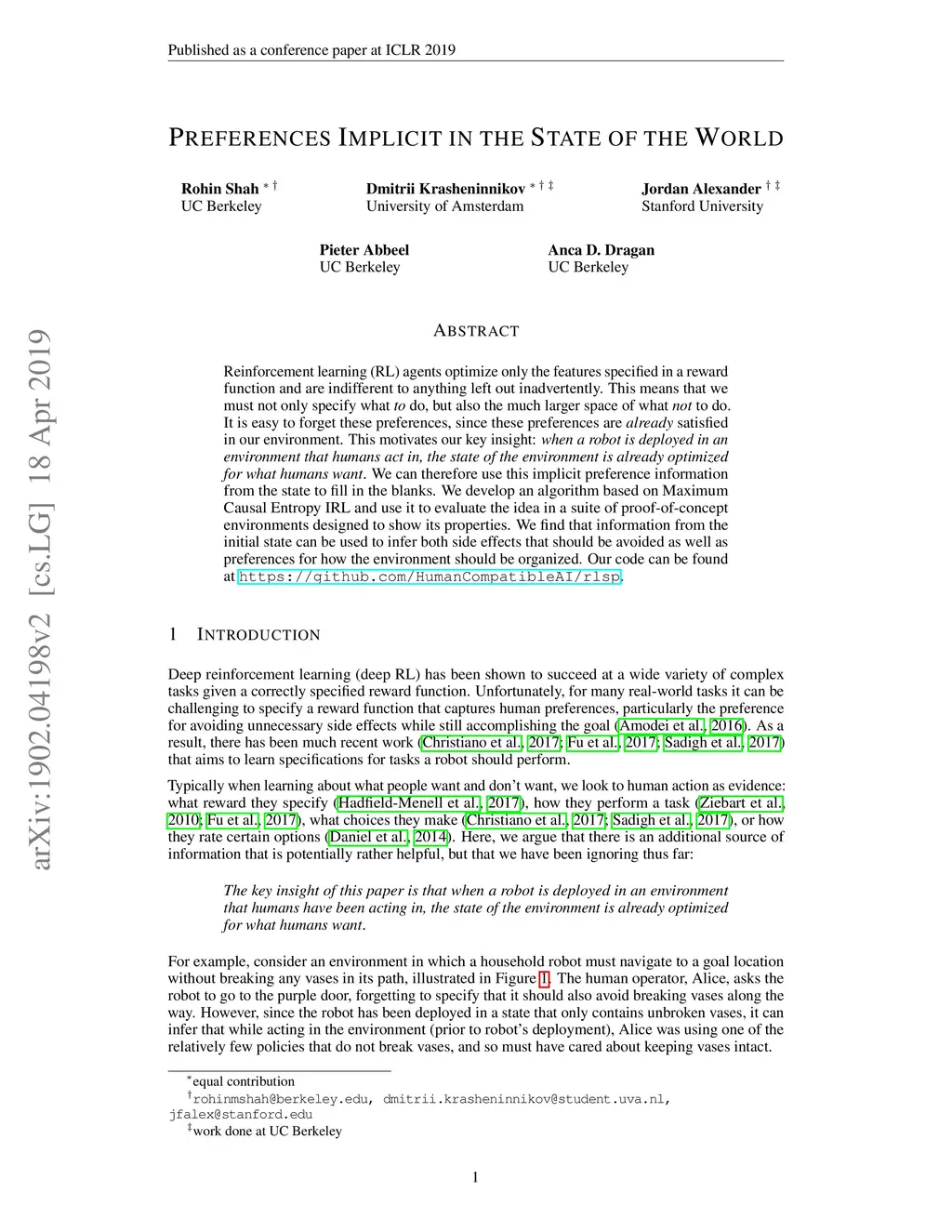 Reinforcement learning (RL) agents optimize only the features specified in a reward function and are indifferent to anything left out inadvertently. This means that we must not only specify what to do, but also the much larger space of what not to do. It is easy to forget these preferences, since these preferences are already satisfied in our environment. This motivates our key insight: when a robot is deployed in an environment that humans act in, the state of the environment is already optimized for what humans want. We can therefore use this implicit preference information from the state to fill in the blanks. We develop an algorithm based on Maximum Causal Entropy IRL and use it to evaluate the idea in a suite of proof-of-concept environments designed to show its properties. We find that information from the initial state can be used to infer both side effects that should be avoided as well as preferences for how the environment should be organized. Our code can be found at https://github.com/HumanCompatibleAI/rlsp.