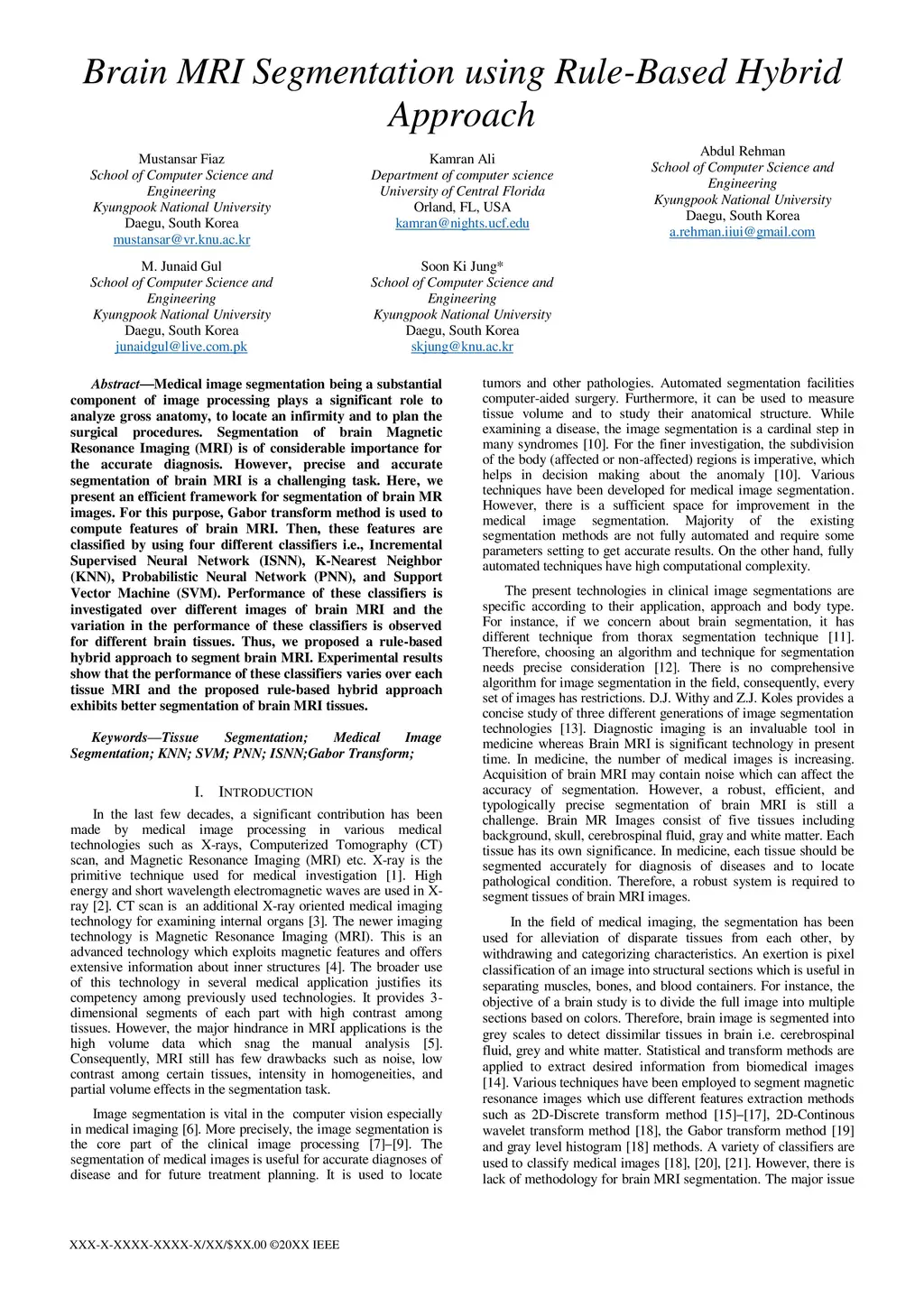 Medical image segmentation being a substantial component of image processing plays a significant role to analyze gross anatomy, to locate an infirmity and to plan the surgical procedures. Segmentation of brain Magnetic Resonance Imaging (MRI) is of considerable importance for the accurate diagnosis. However, precise and accurate segmentation of brain MRI is a challenging task. Here, we present an efficient framework for segmentation of brain MR images. For this purpose, Gabor transform method is used to compute features of brain MRI. Then, these features are classified by using four different classifiers i.e., Incremental Supervised Neural Network (ISNN), K-Nearest Neighbor (KNN), Probabilistic Neural Network (PNN), and Support Vector Machine (SVM). Performance of these classifiers is investigated over different images of brain MRI and the variation in the performance of these classifiers is observed for different brain tissues. Thus, we proposed a rule-based hybrid approach to segment brain MRI. Experimental results show that the performance of these classifiers varies over each tissue MRI and the proposed rule-based hybrid approach exhibits better segmentation of brain MRI tissues.