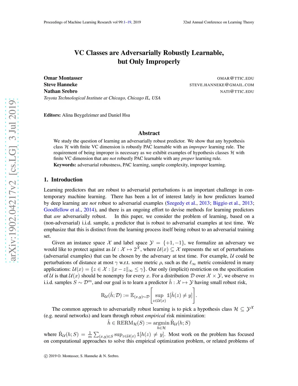 We study the question of learning an adversarially robust predictor. We show that any hypothesis class with finite VC dimension is robustly PAC learnable with an improper learning rule. The requirement of being improper is necessary as we exhibit examples of hypothesis classes with finite VC dimension that are not robustly PAC learnable with any proper learning rule.