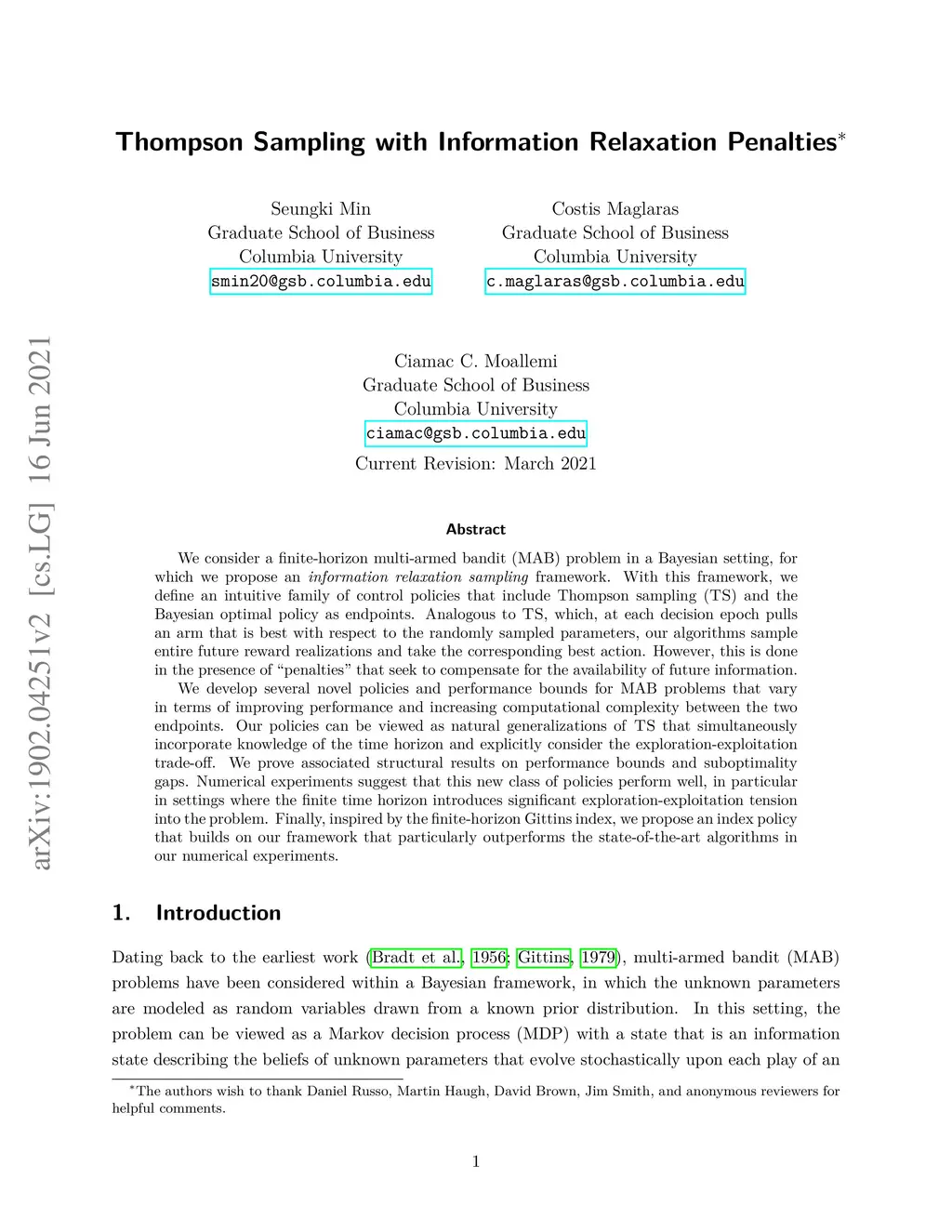 We consider a finite-horizon multi-armed bandit (MAB) problem in a Bayesian setting, for which we propose an information relaxation sampling framework. With this framework, we define an intuitive family of control policies that include Thompson sampling (TS) and the Bayesian optimal policy as endpoints. Analogous to TS, which, at each decision epoch pulls an arm that is best with respect to the randomly sampled parameters, our algorithms sample entire future reward realizations and take the corresponding best action. However, this is done in the presence of "penalties" that seek to compensate for the availability of future information. We develop several novel policies and performance bounds for MAB problems that vary in terms of improving performance and increasing computational complexity between the two endpoints. Our policies can be viewed as natural generalizations of TS that simultaneously incorporate knowledge of the time horizon and explicitly consider the exploration-exploitation trade-off. We prove associated structural results on performance bounds and suboptimality gaps. Numerical experiments suggest that this new class of policies perform well, in particular in settings where the finite time horizon introduces significant exploration-exploitation tension into the problem. Finally, inspired by the finite-horizon Gittins index, we propose an index policy that builds on our framework that particularly outperforms the state-of-the-art algorithms in our numerical experiments.