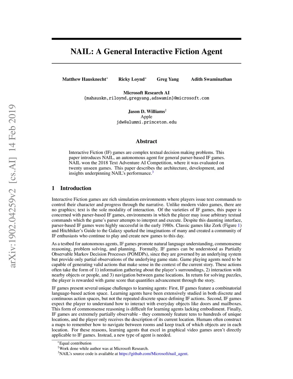 Interactive Fiction (IF) games are complex textual decision making problems. This paper introduces NAIL, an autonomous agent for general parser-based IF games. NAIL won the 2018 Text Adventure AI Competition, where it was evaluated on twenty unseen games. This paper describes the architecture, development, and insights underpinning NAIL's performance.
